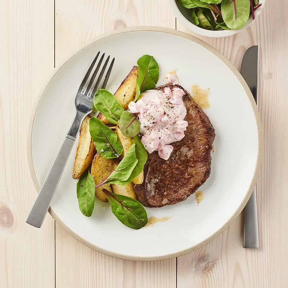 Minutbiff med bakade potatisskivor och tzatziki