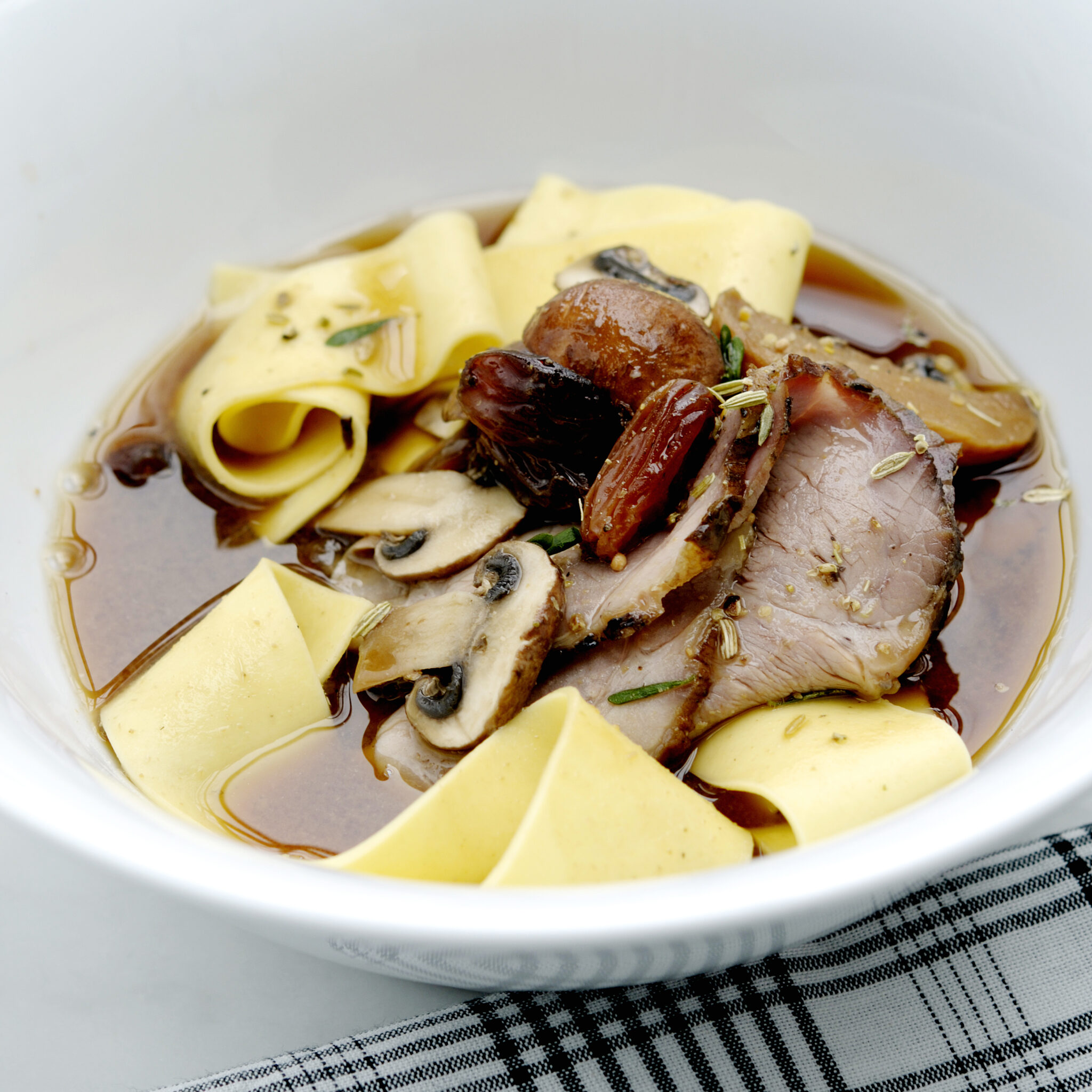 Kyckling, svamp och nudlar i miso- och röd currybuljong