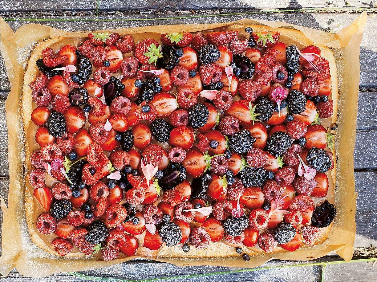 Mandeltårta med mjölkchokladmousse och jordgubbar