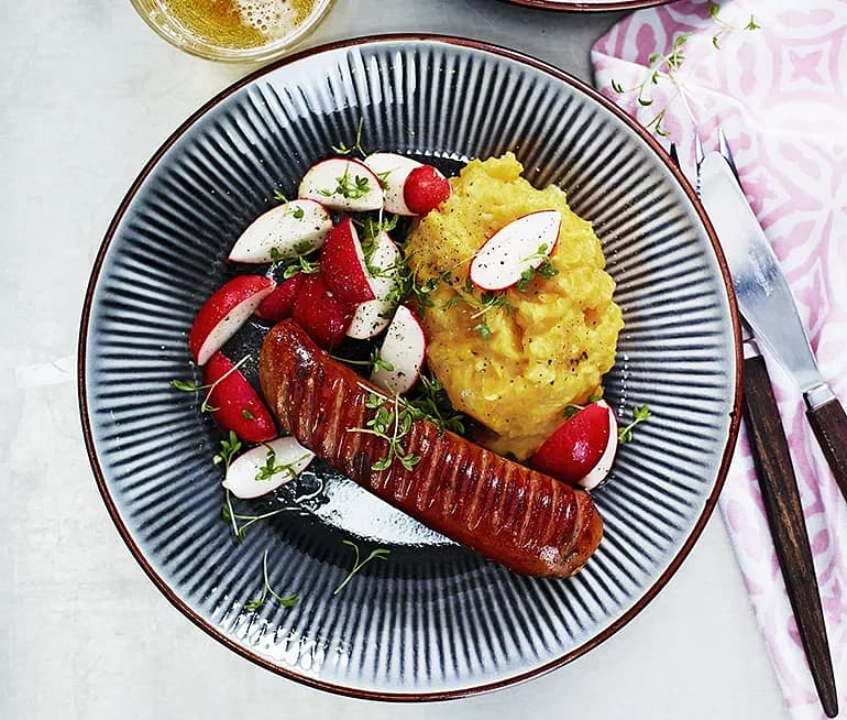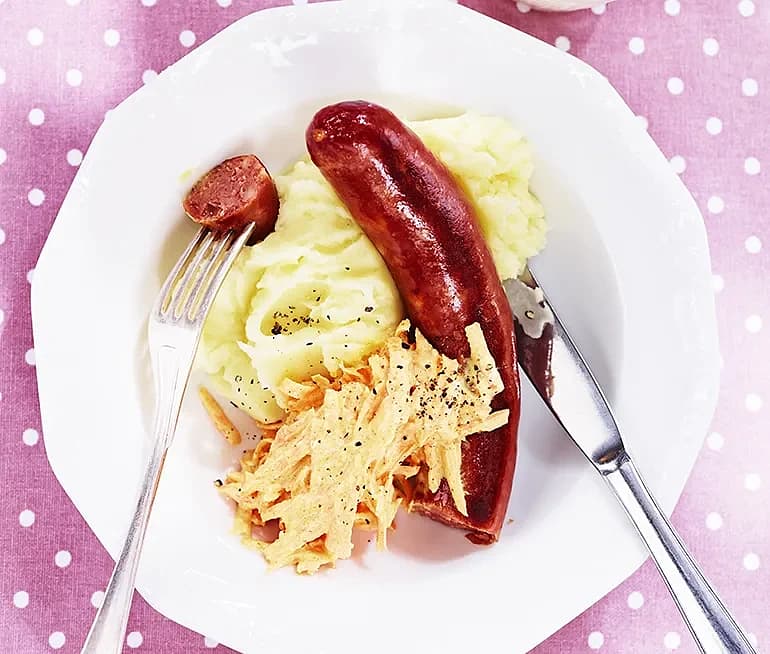 Kryddig korv med morot- och ingefärsmos
