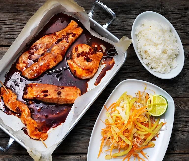 Sallad av vaxbönor och morot med lax yakitori