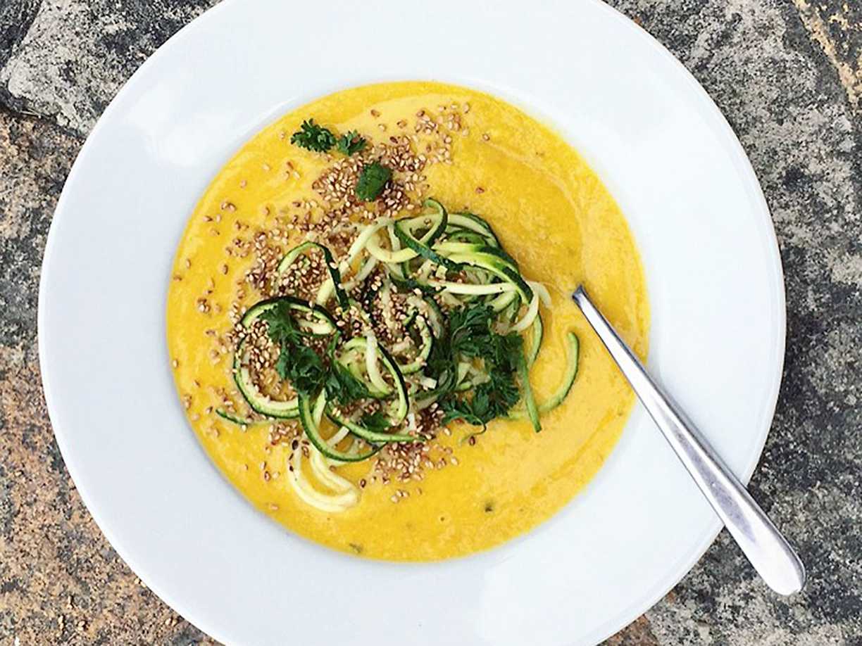 Gyllene morots- och kokossoppa med zucchini- och persiljetopping