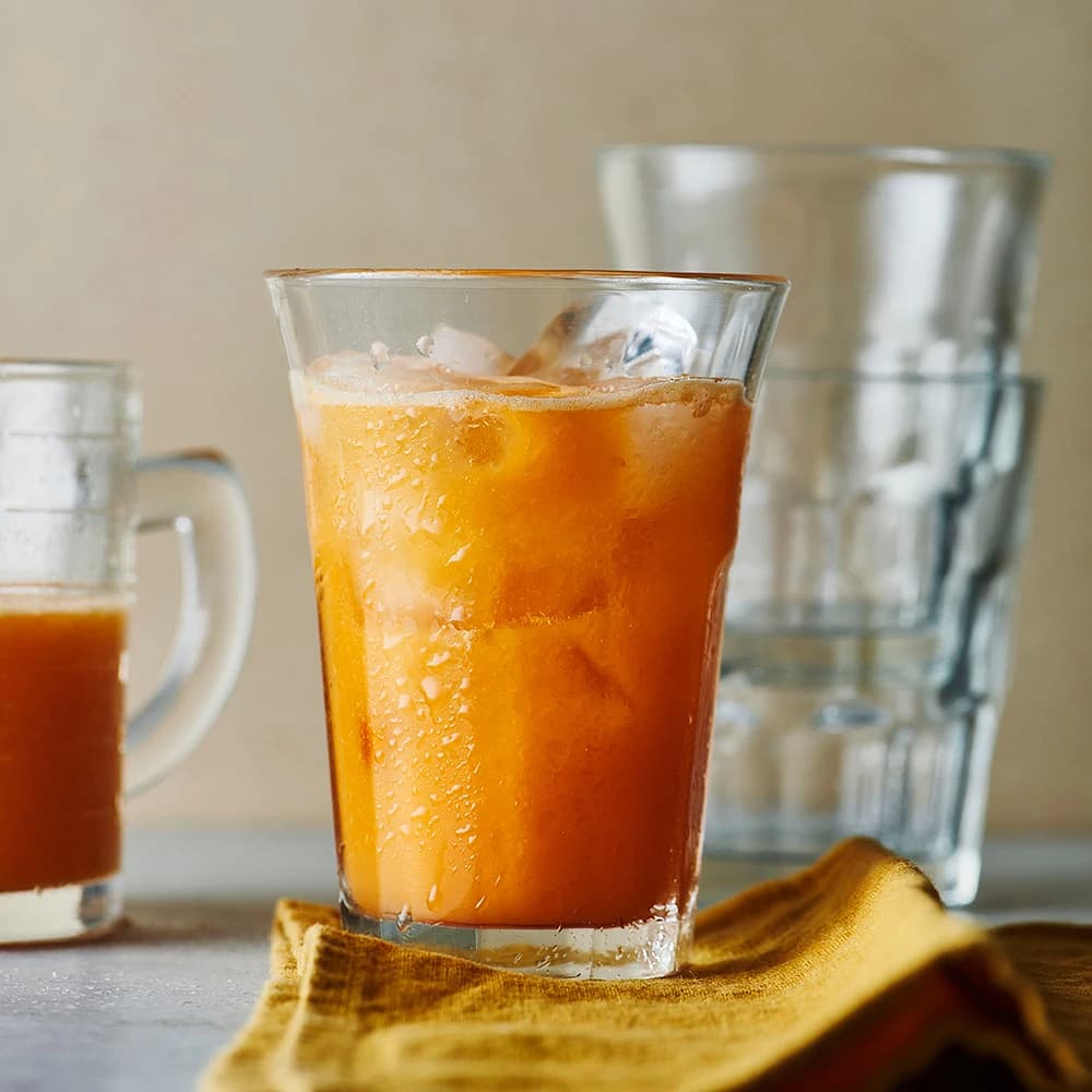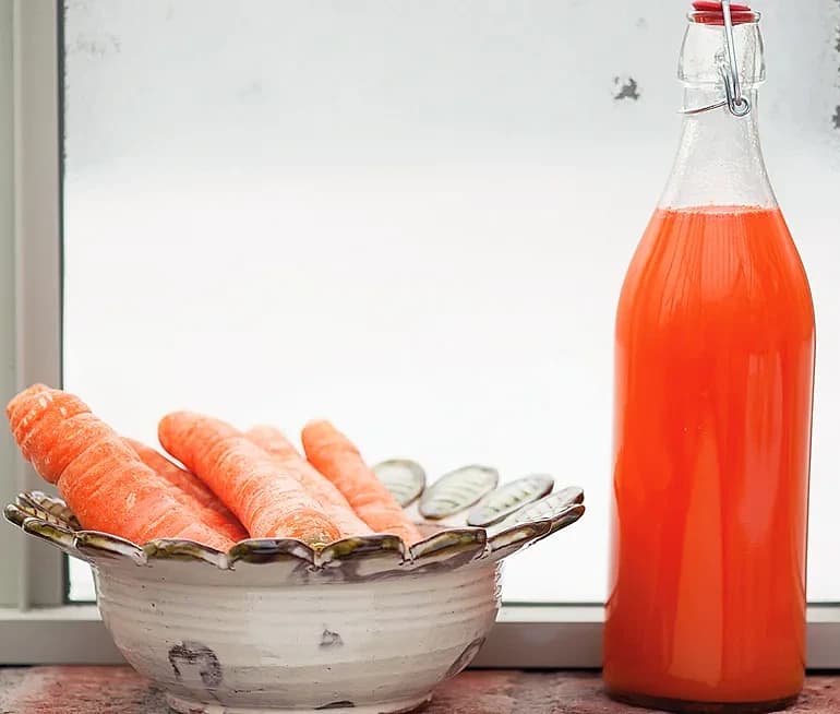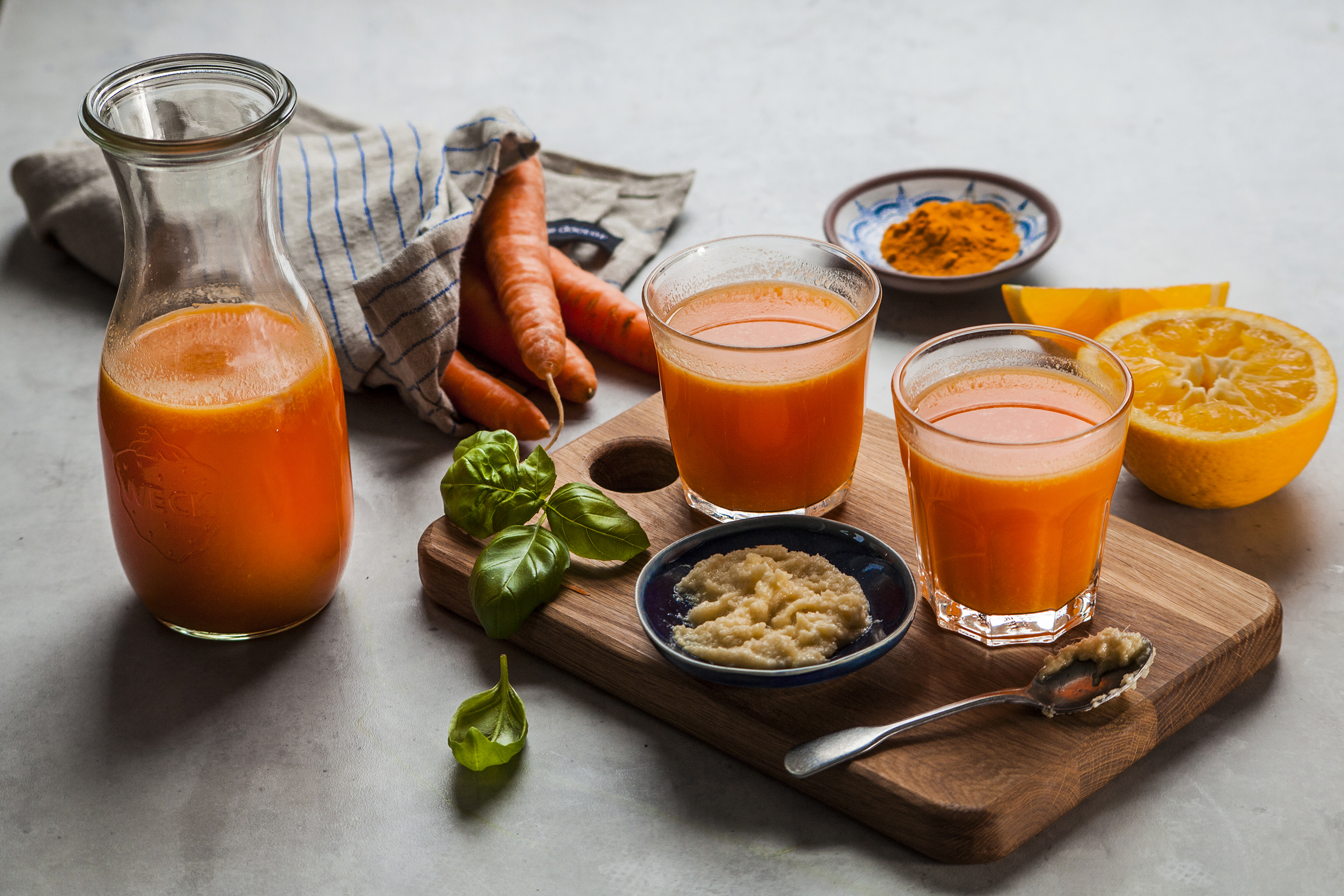 Färskpressad apelsin- och morotsjuice med ingefära och gurkmeja