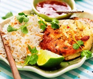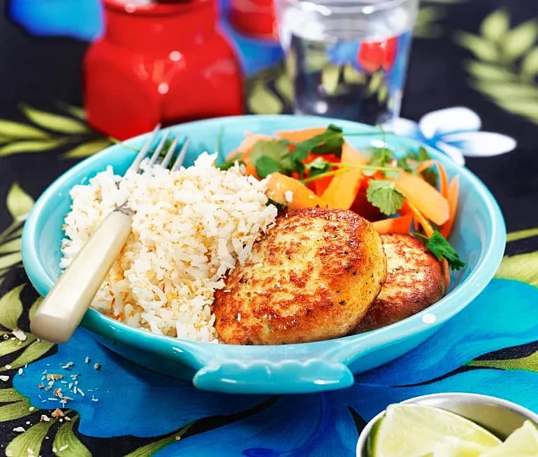 Thailändska ”fishcakes” med kokosris och morotssallad