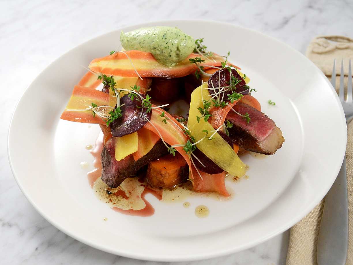 Timjanstekt biff med helbakade morötter, morotssallad och kryddsmör