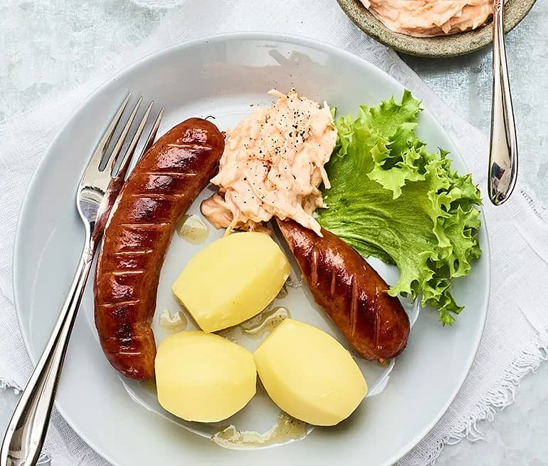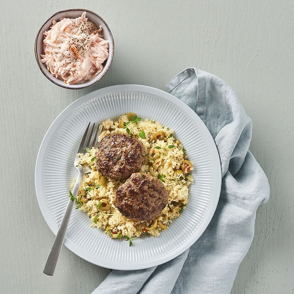 Lammfärsbiffar med morotstzatziki och klyftpotatis