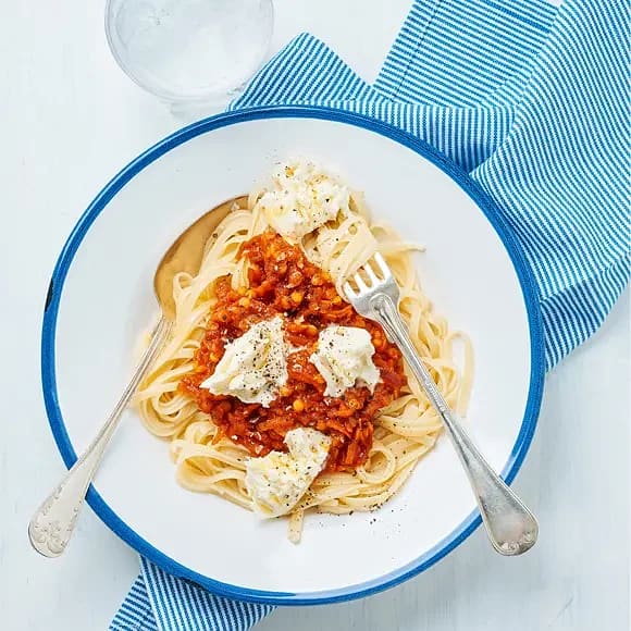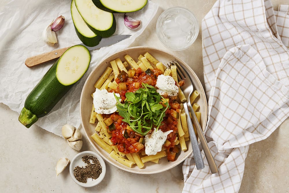 Kikärtspasta i tomatsås med vitlöksrostad aubergine och mozzarella