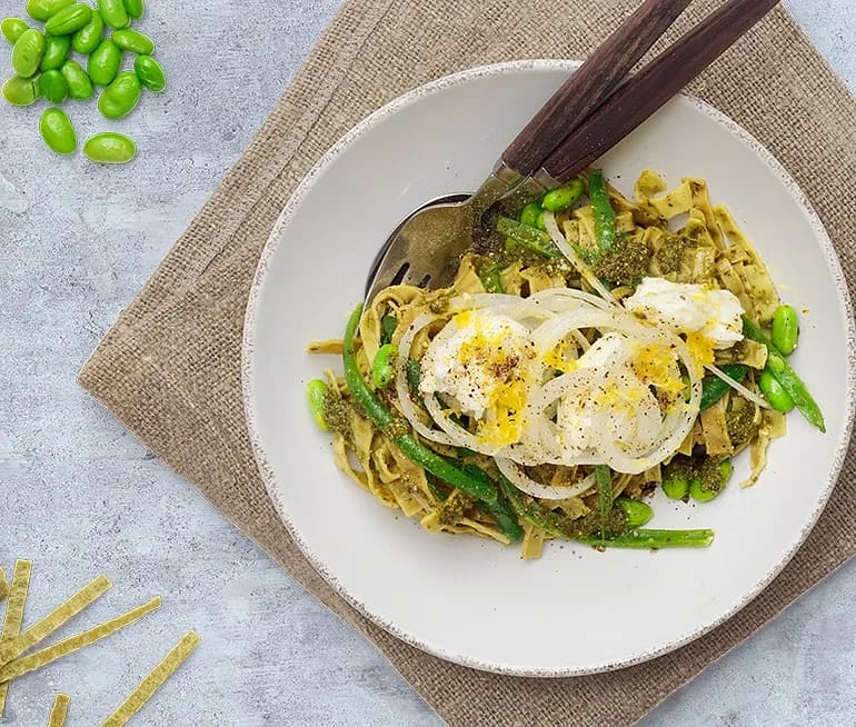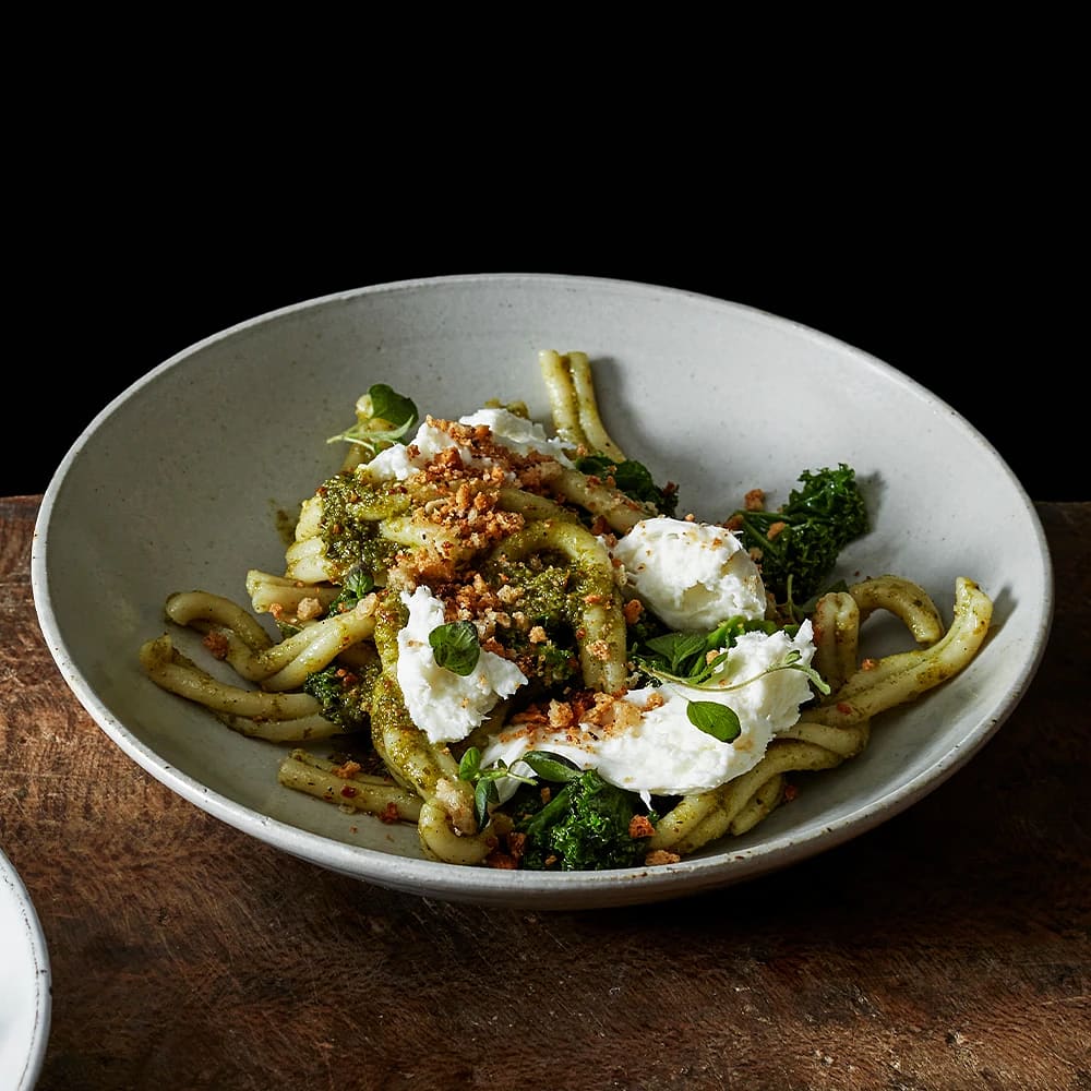 Casarecce med grönkålsharissa, mozzarella och pangrattato