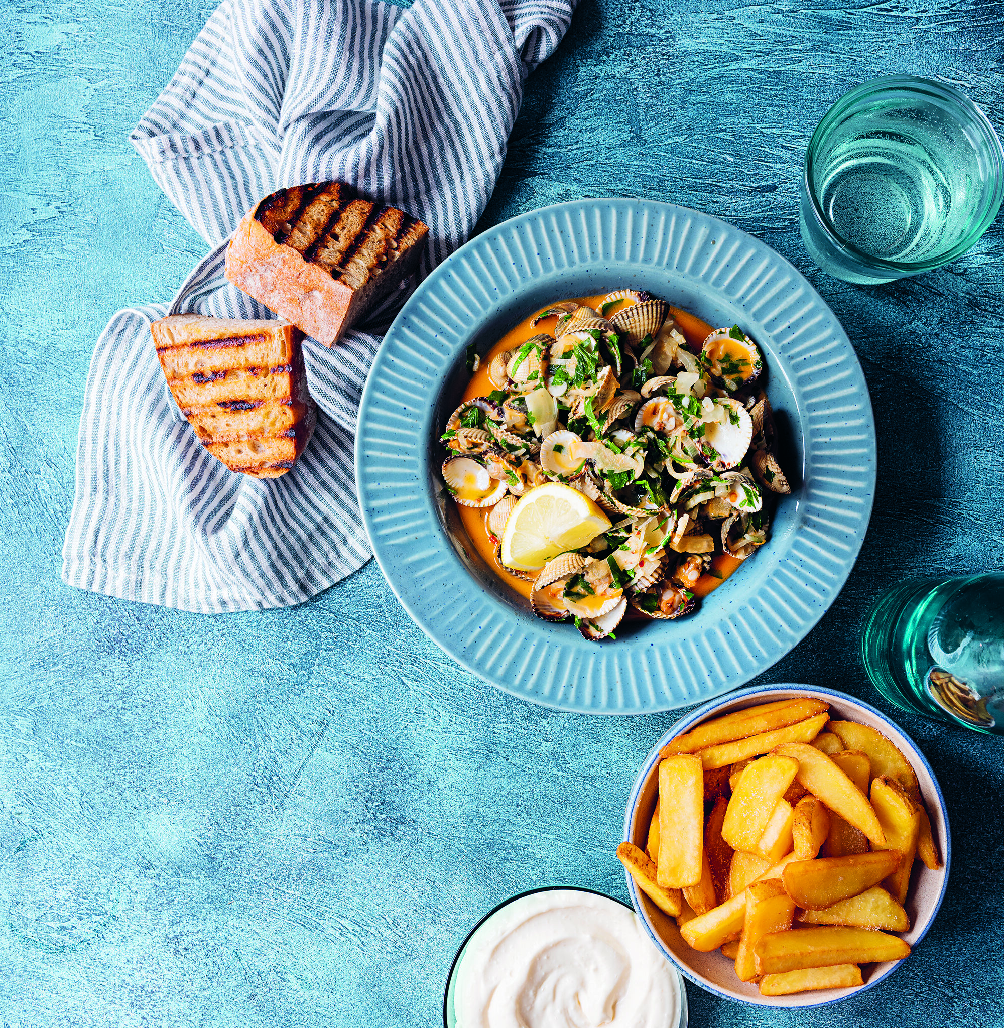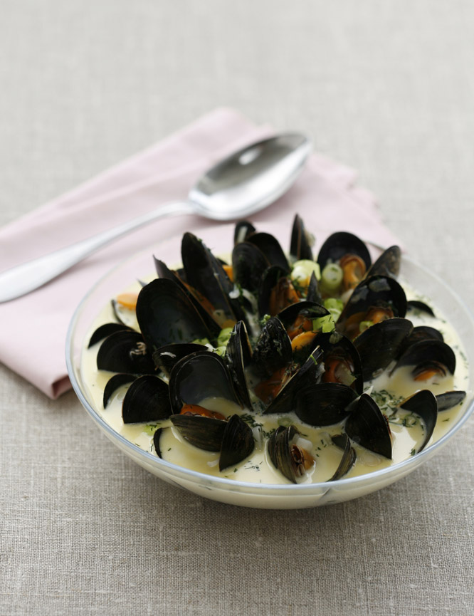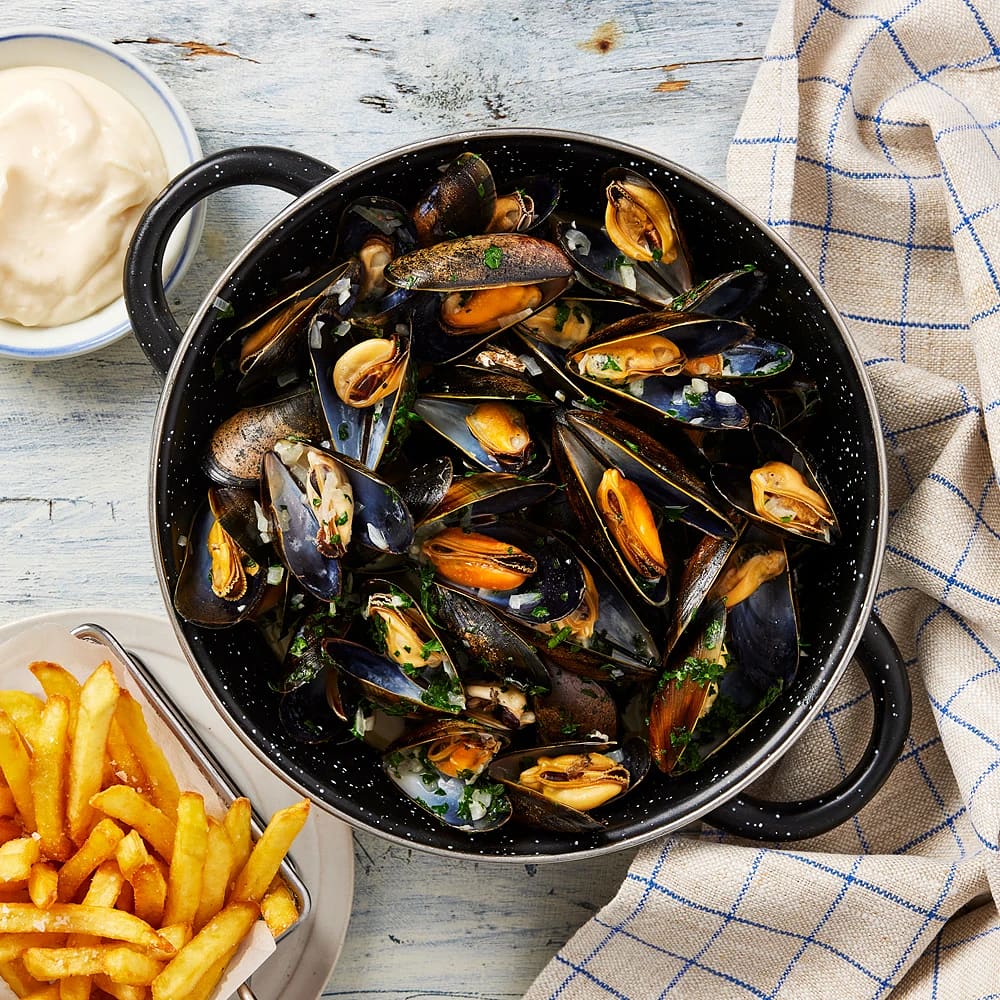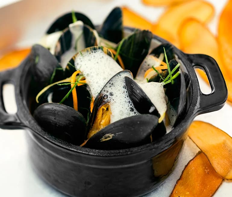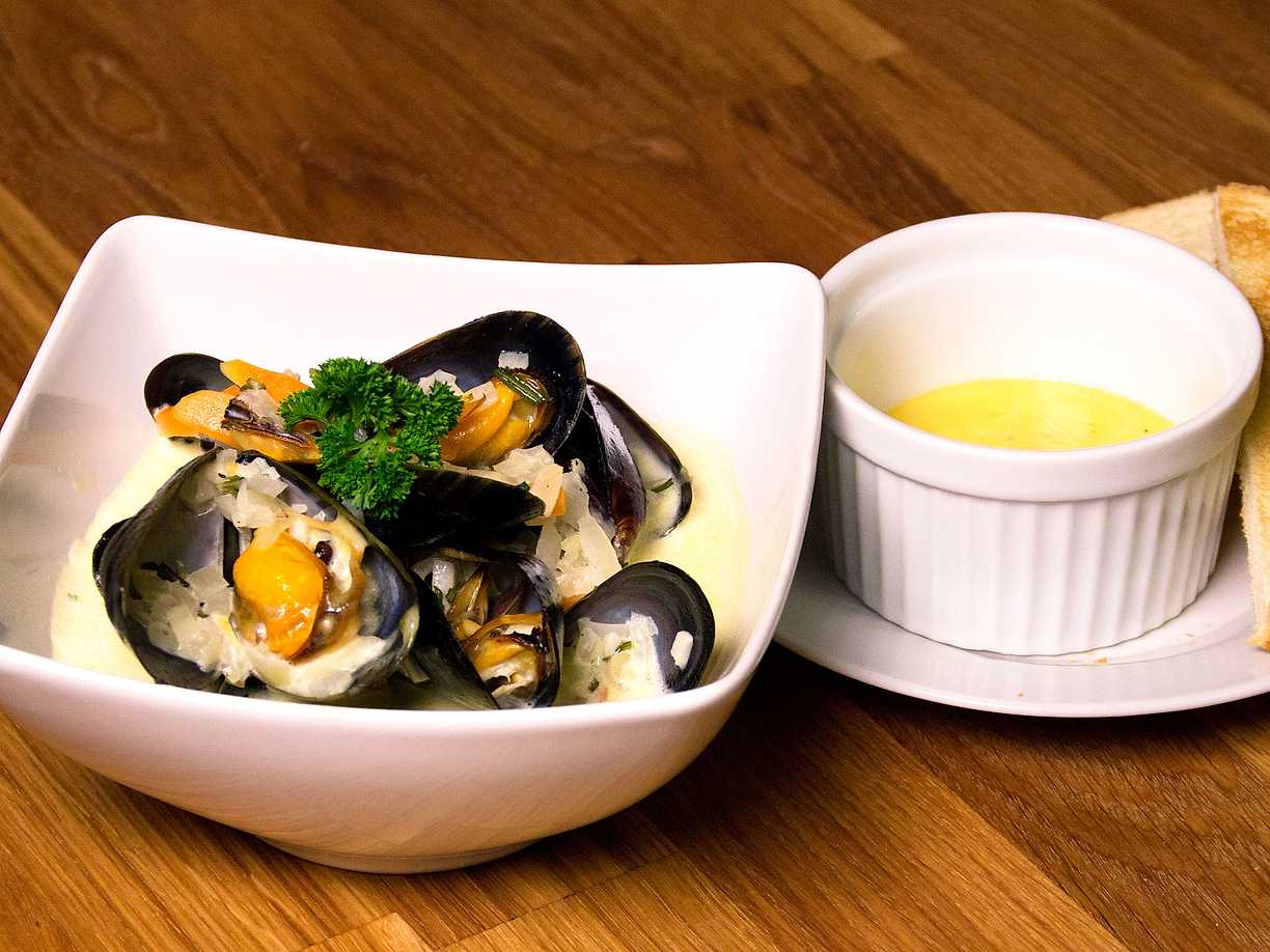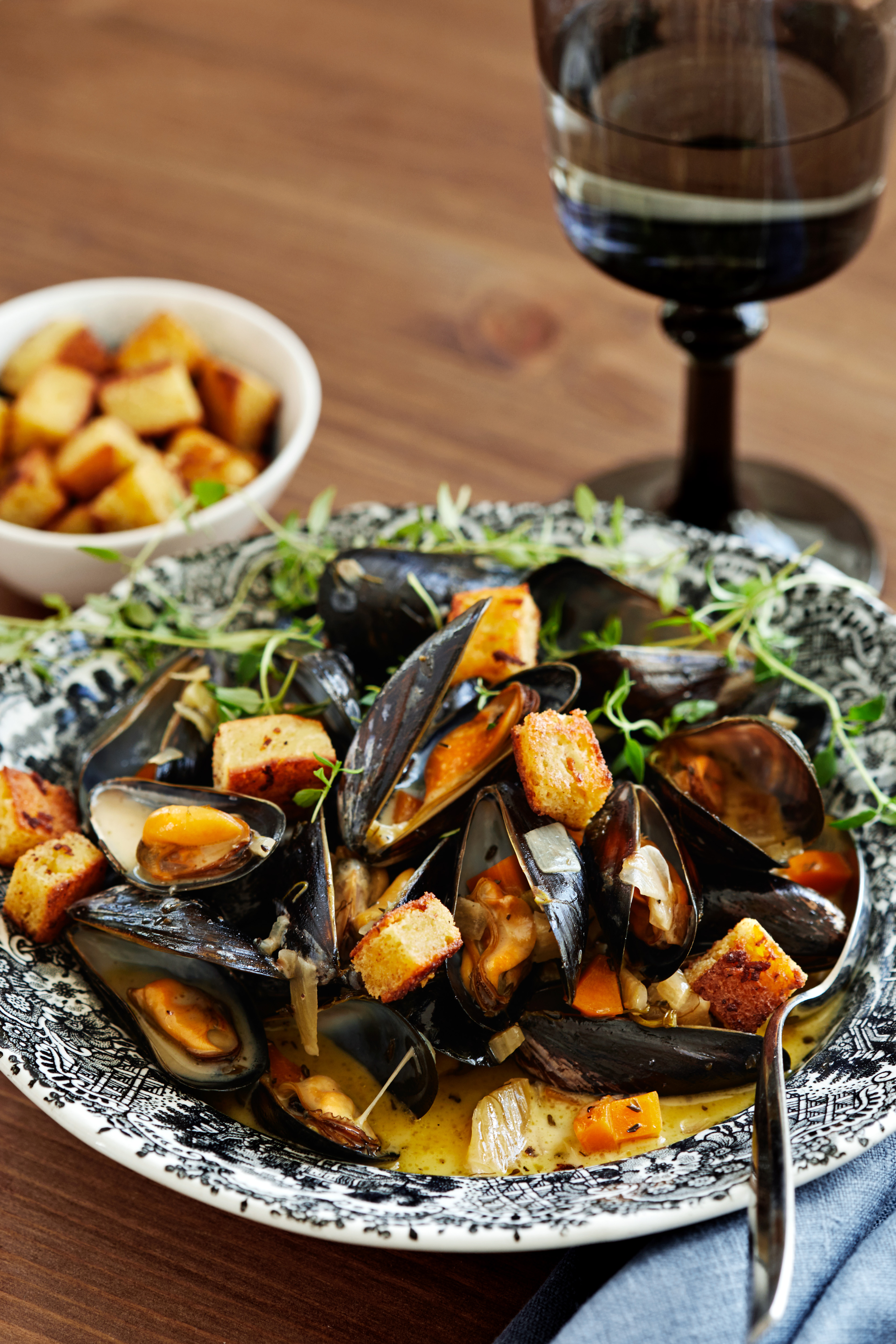 Fiskgryta med musslor, krutonger och vitlöksmajonnäs