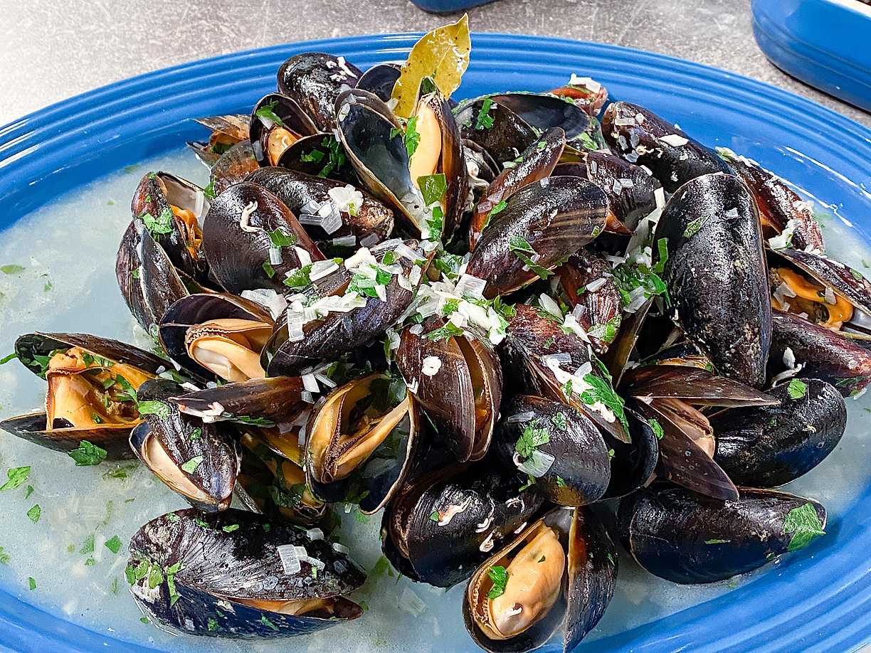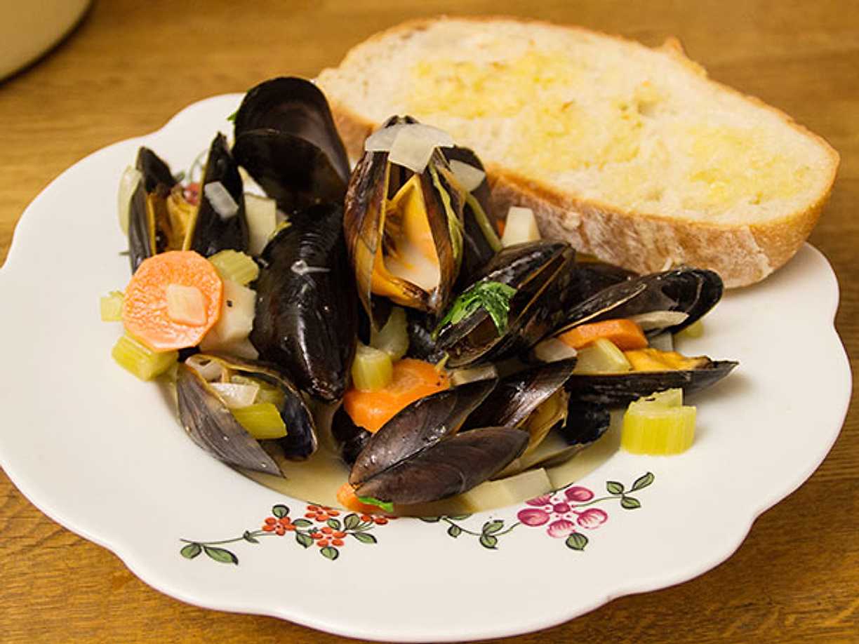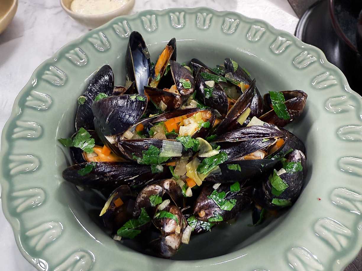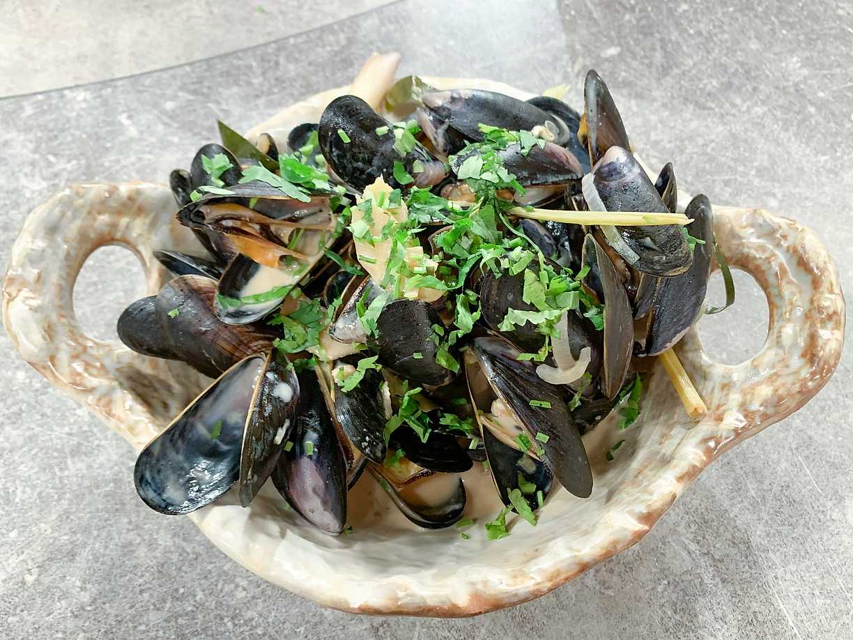 Musslor med blekselleri, vitlök, vitt vin och rökt sidfläsk
