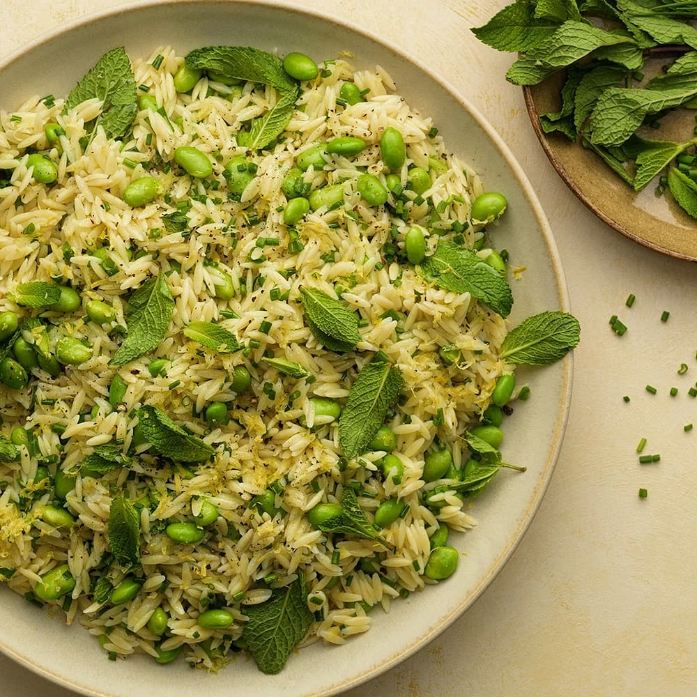 Risonisallad med sojabönor och mynta
