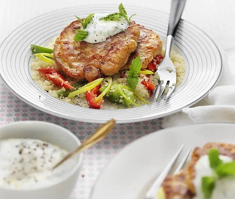 Morotsbiffar med apelsin- och bönsallad och myntayoghurt
