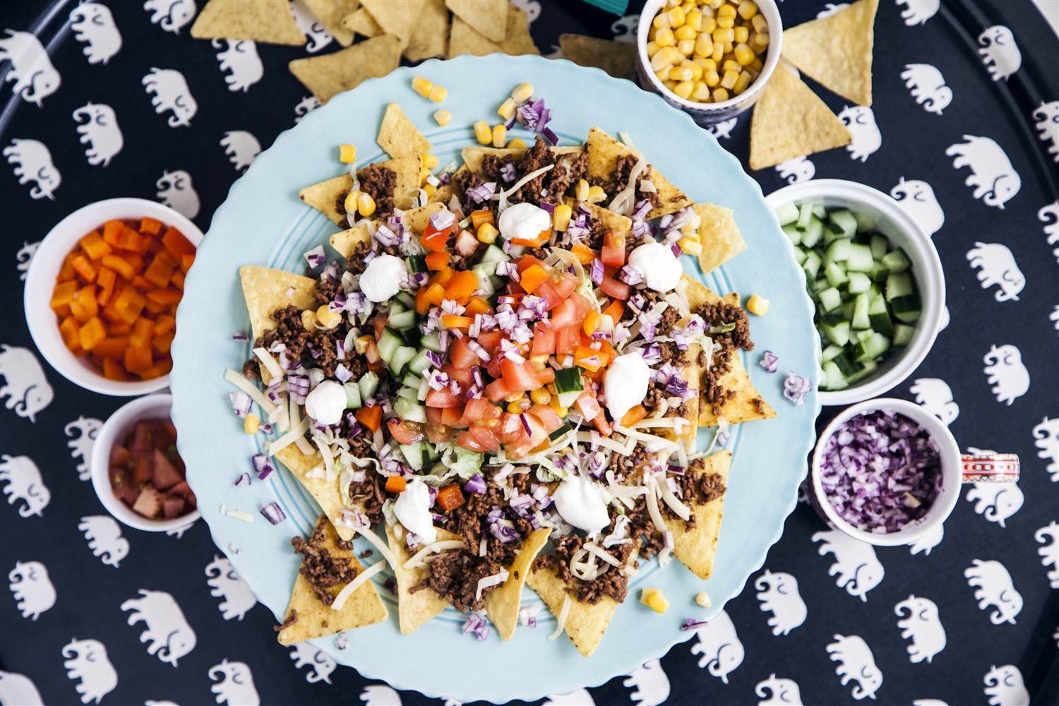 Nachotallrik med tacofärs, ost, jalapeños och guacamole