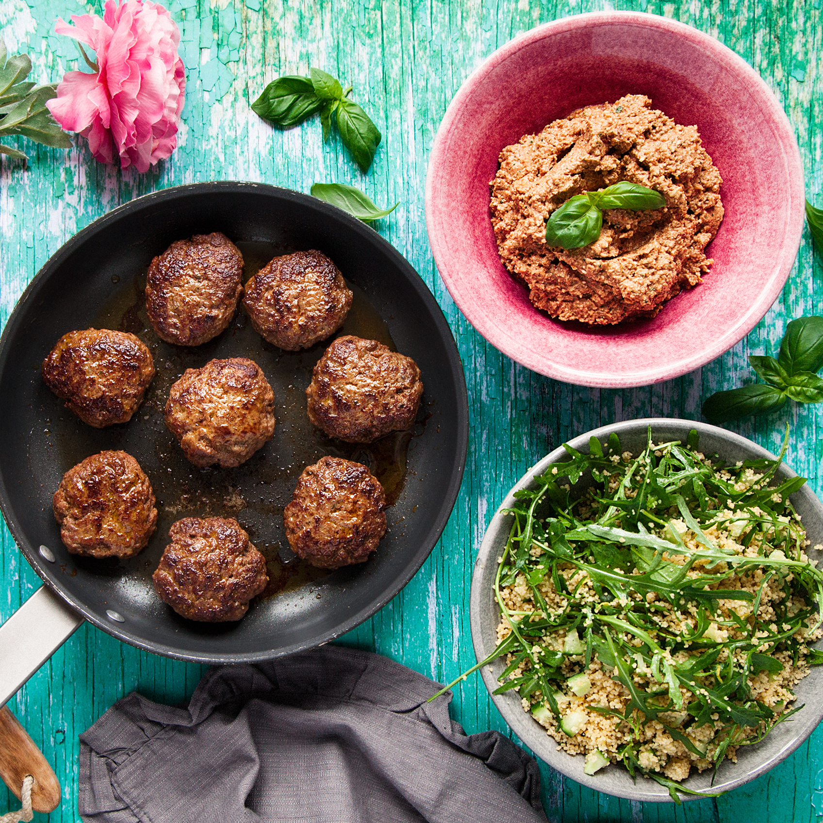Nötfärsbiffar med frisk tomatsalsa, couscous och grönsaksplock