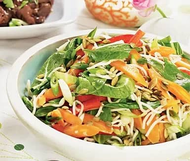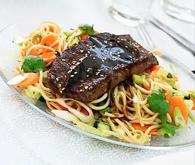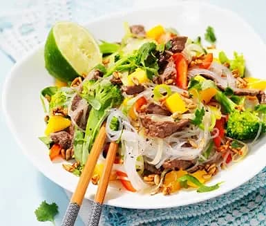 Brynt asiatisk biff med bästa nudelsalladen och ingefärsdressing