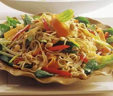 Nudelsallad med jordnötter, mynta och strimlat ägg