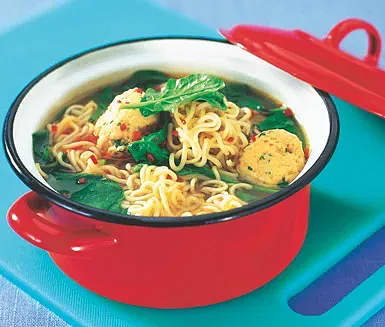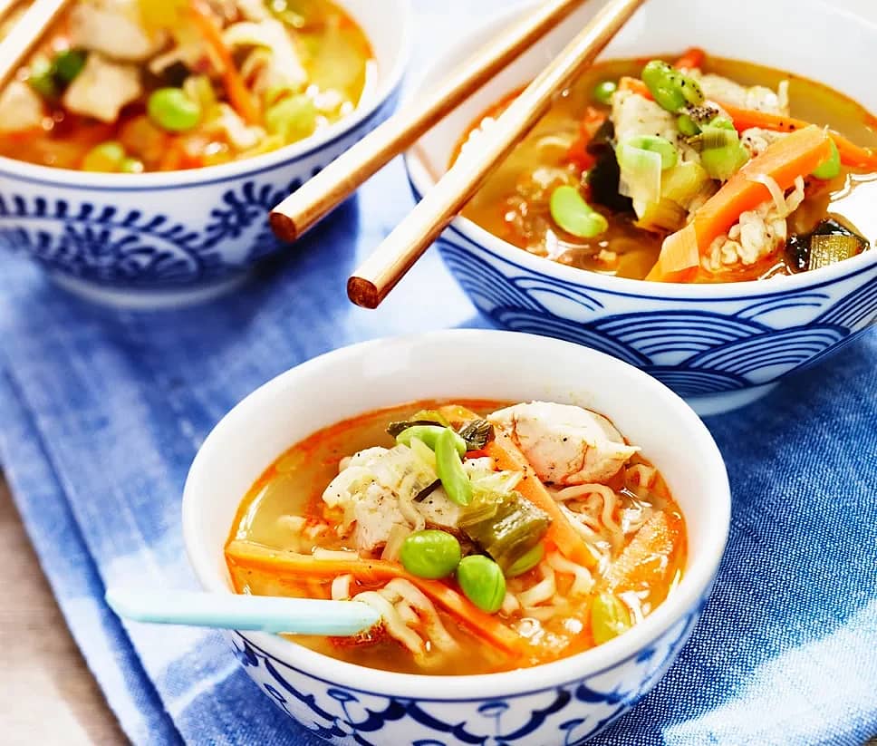 Nudelsoppa med färdiggrillad kyckling och sockerärtor