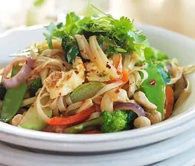 Nudelwok med råa grönsaker och koriander
