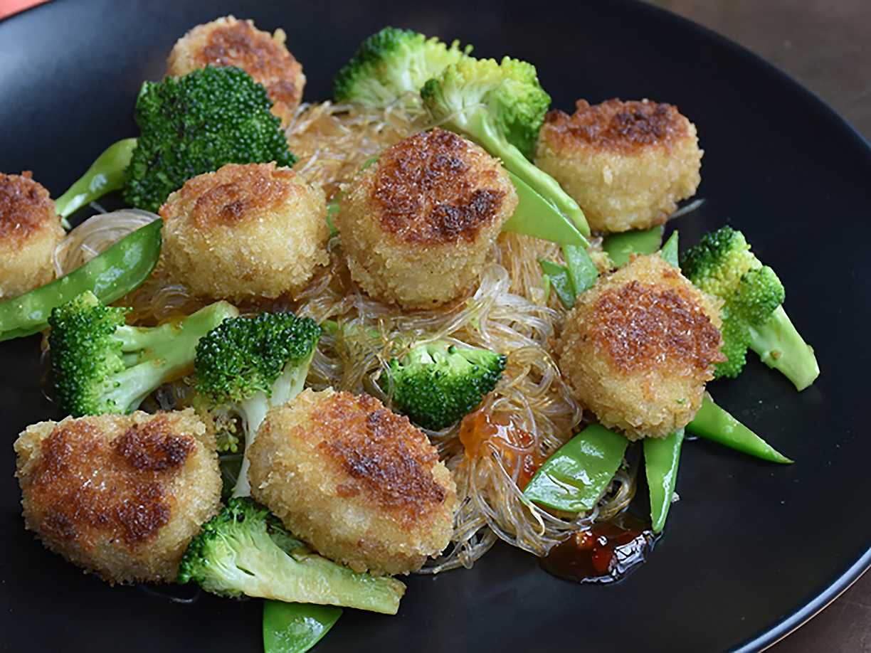 Nudelwok med pankopanerade fiskbullar