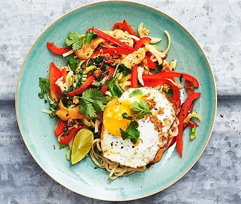 Asiatisk nudelwok med omelettopping