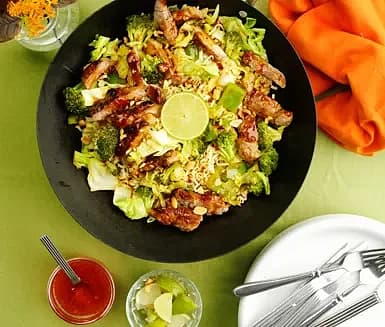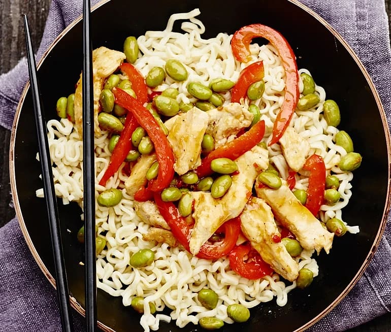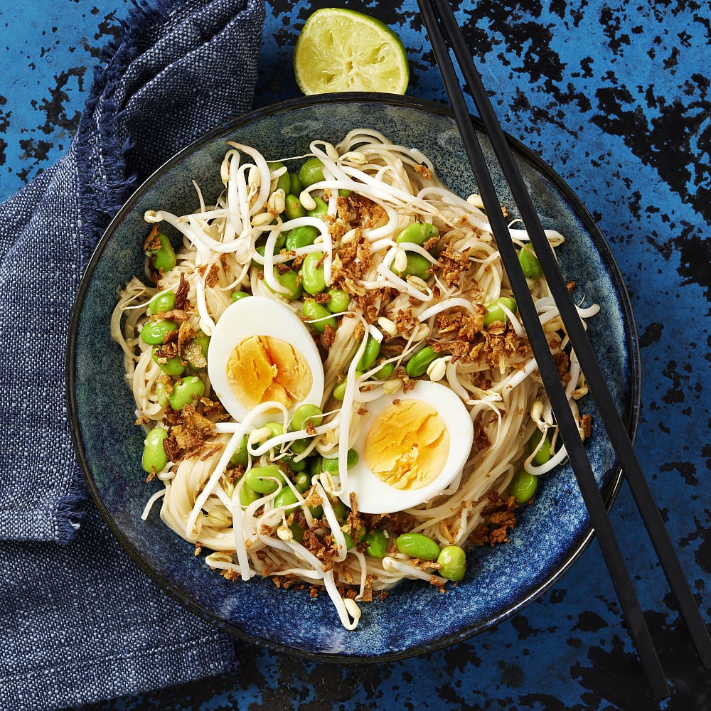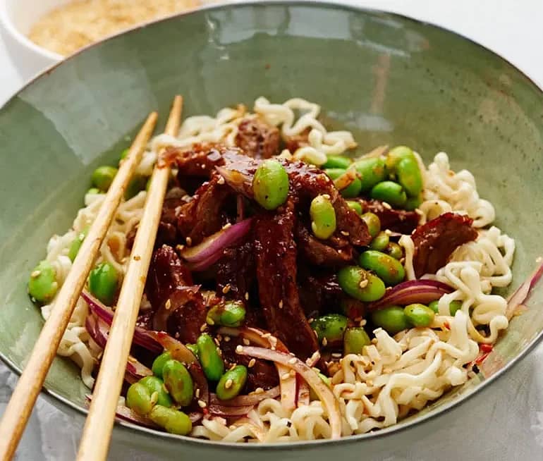 Biffteriyaki med nudlar, lime och marinerade sojabönor