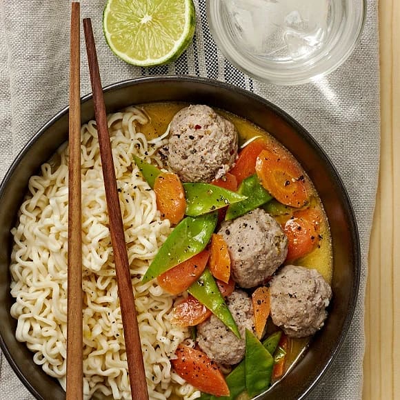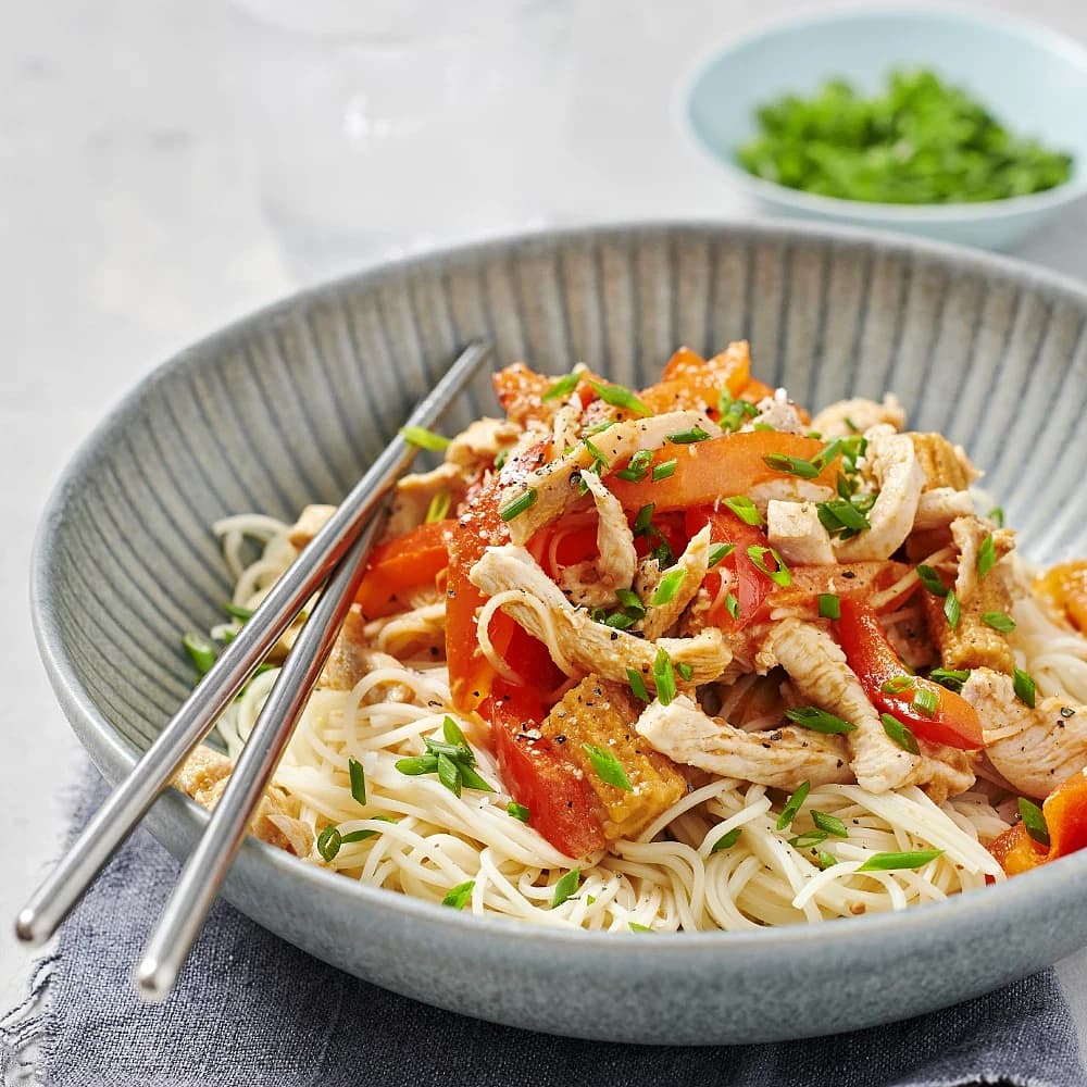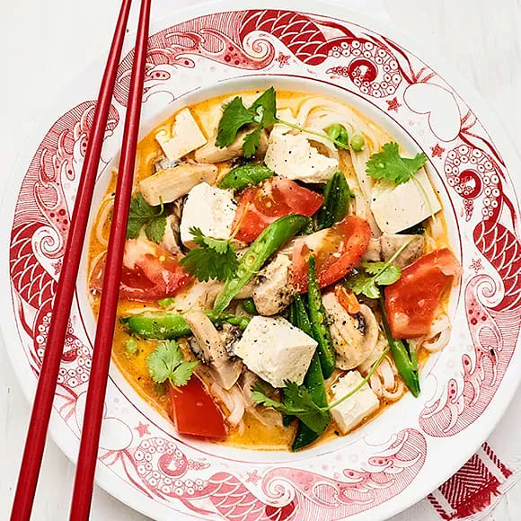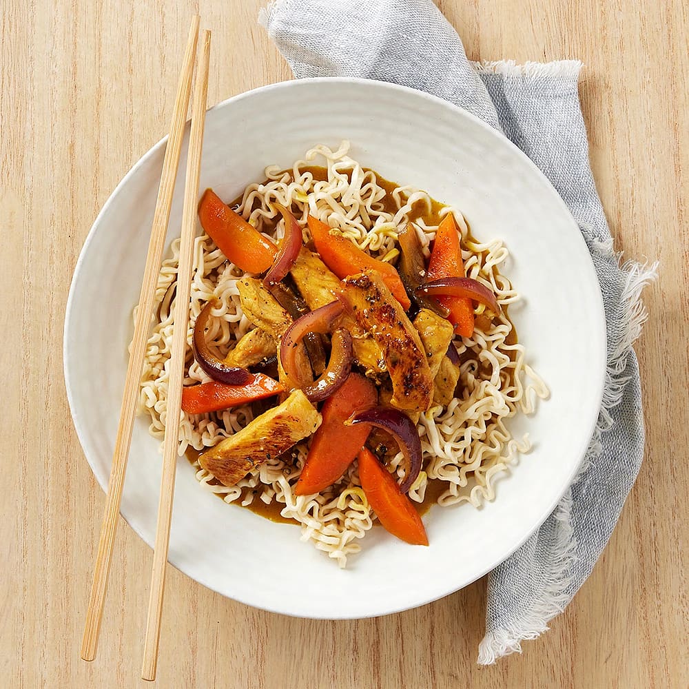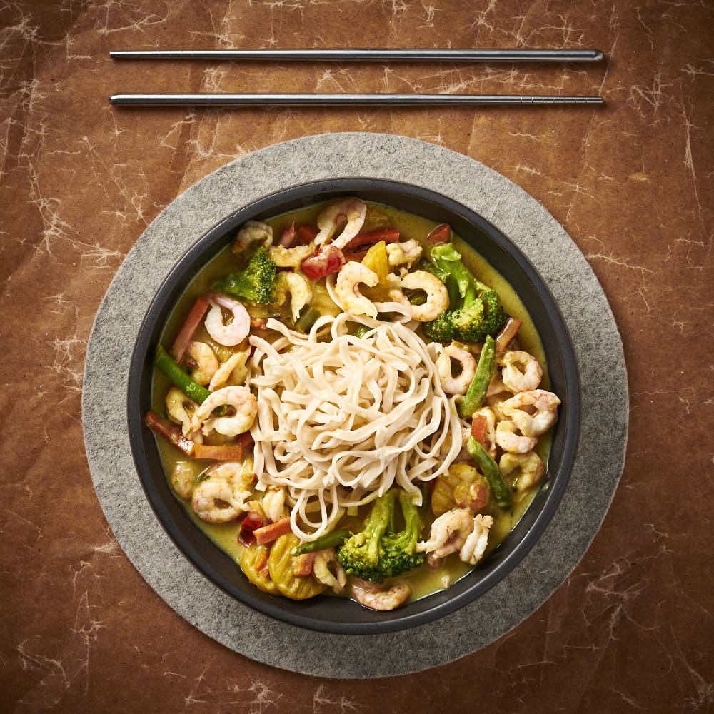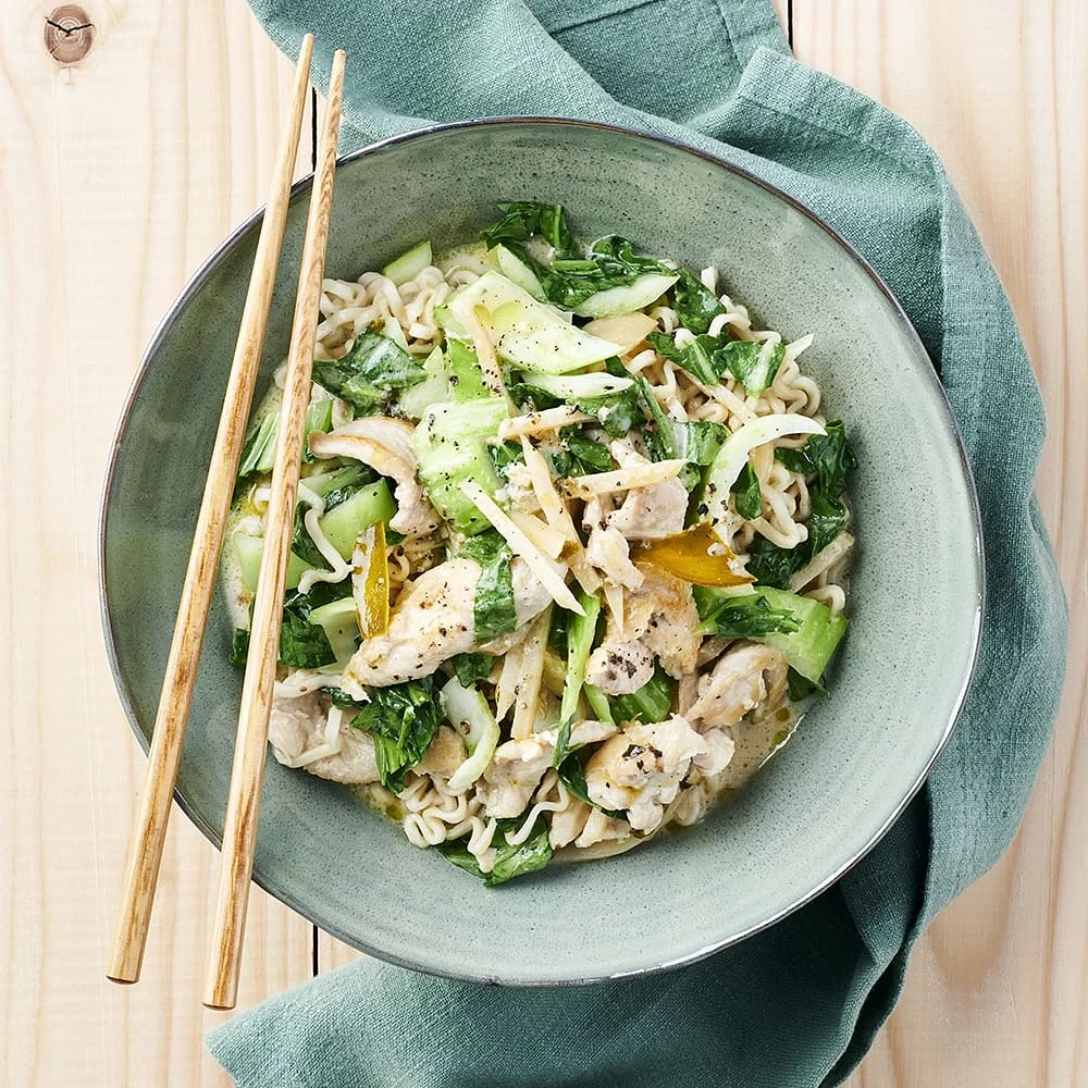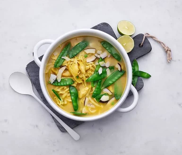 Kycklingfilé i currybuljong med sockerärter och nudlar