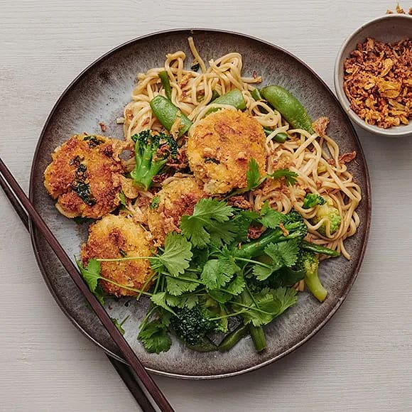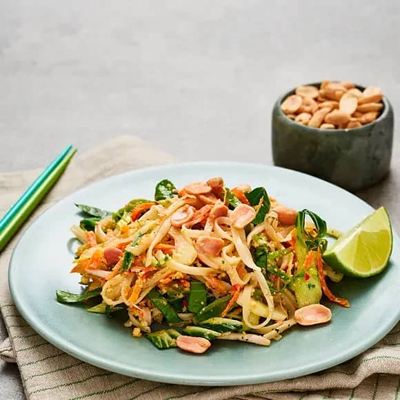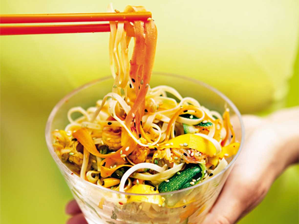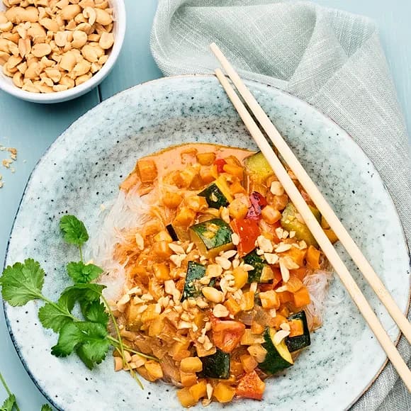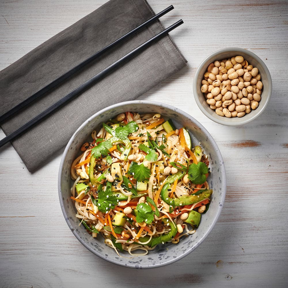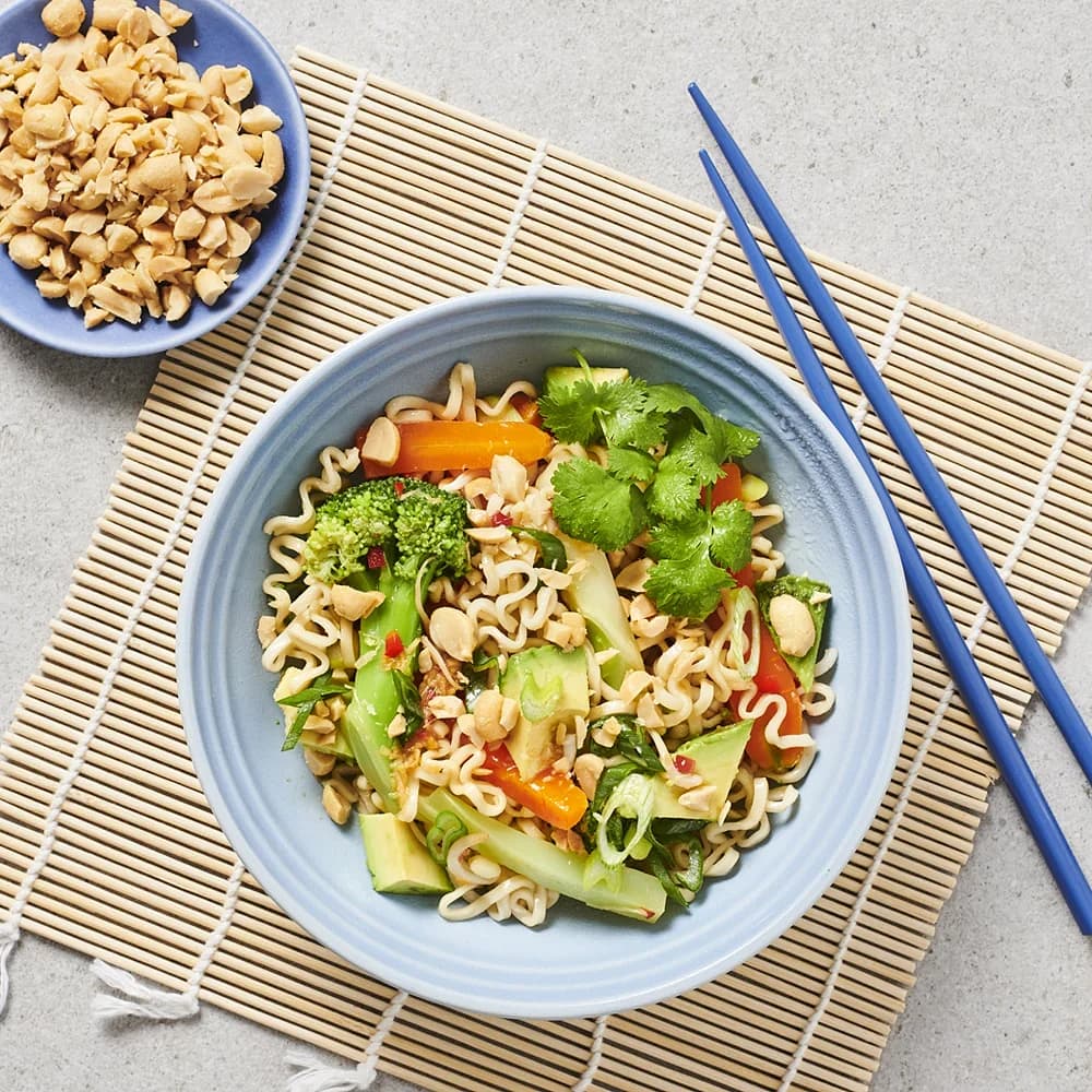 Nudlar med jordnötssås, färs och krispiga grönsaker