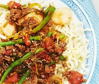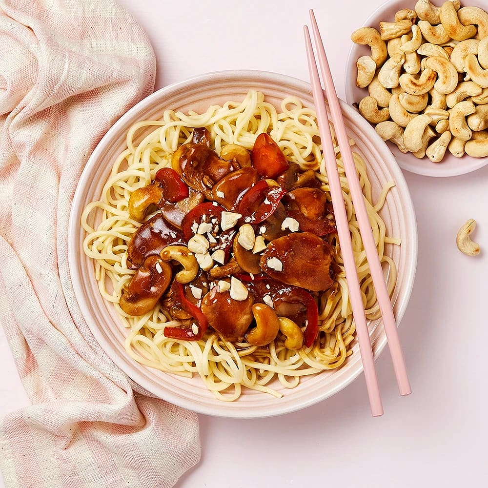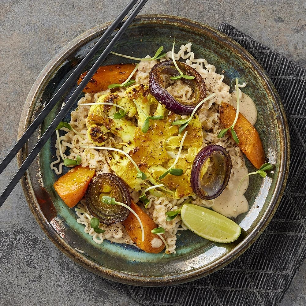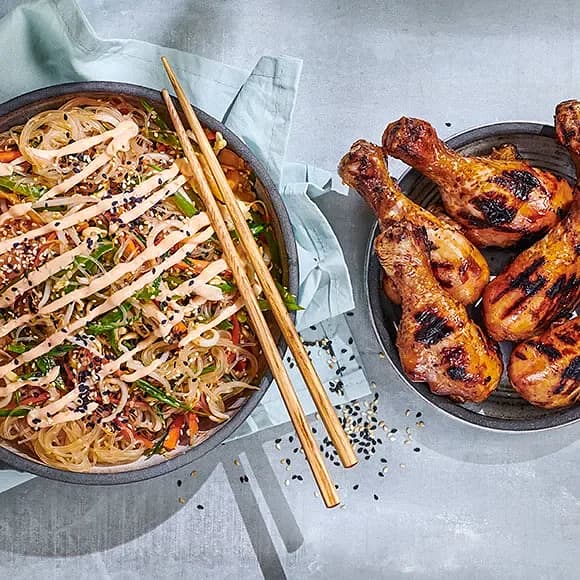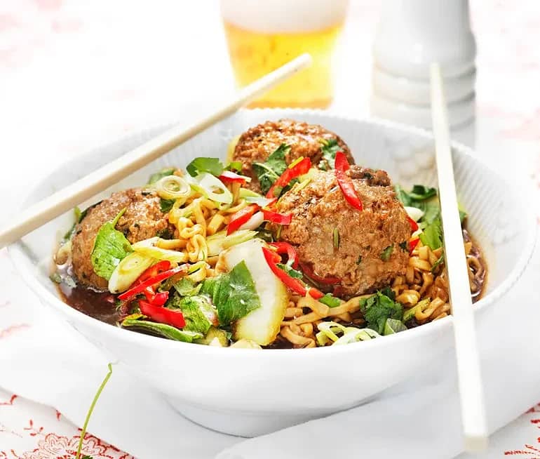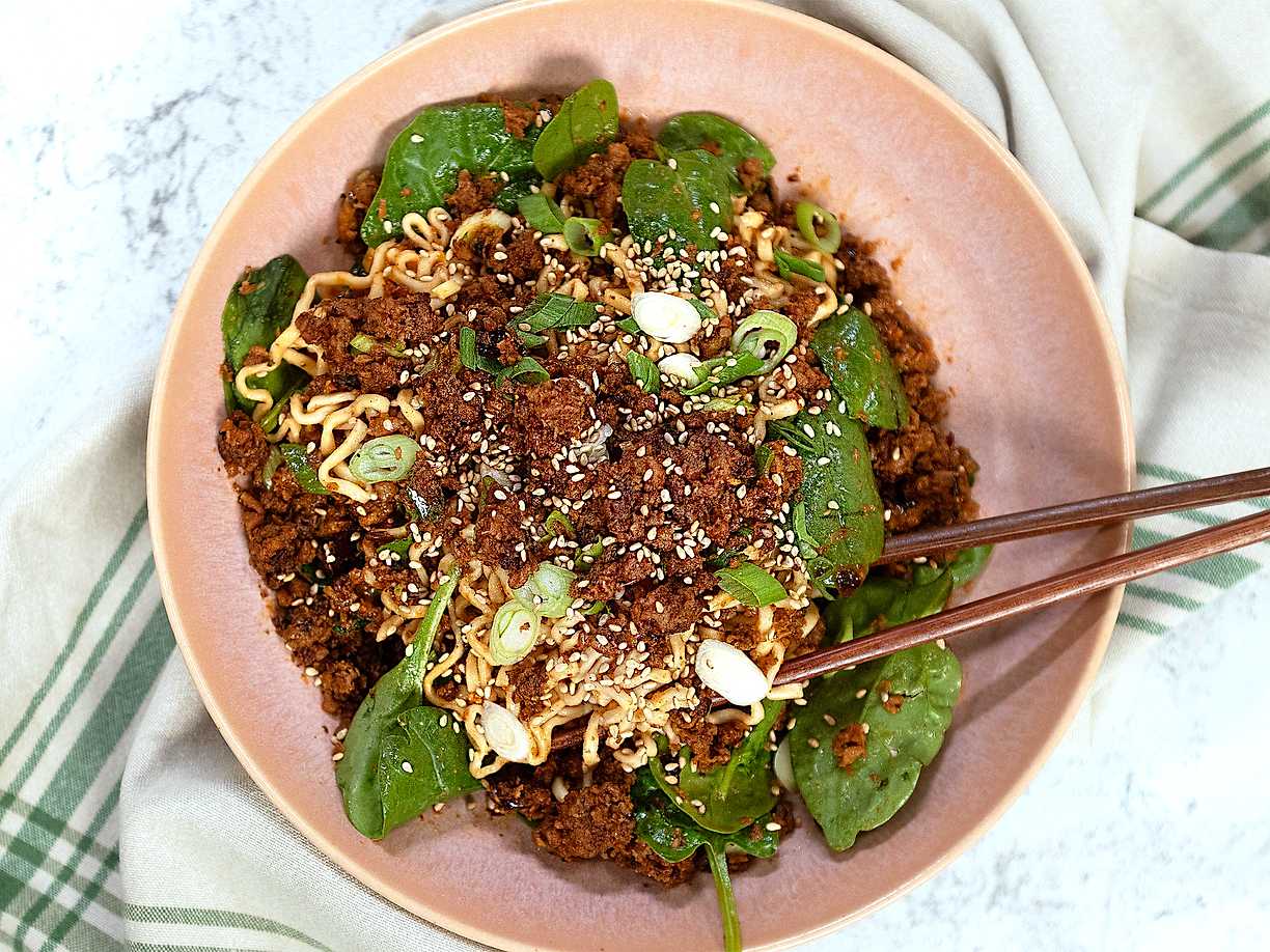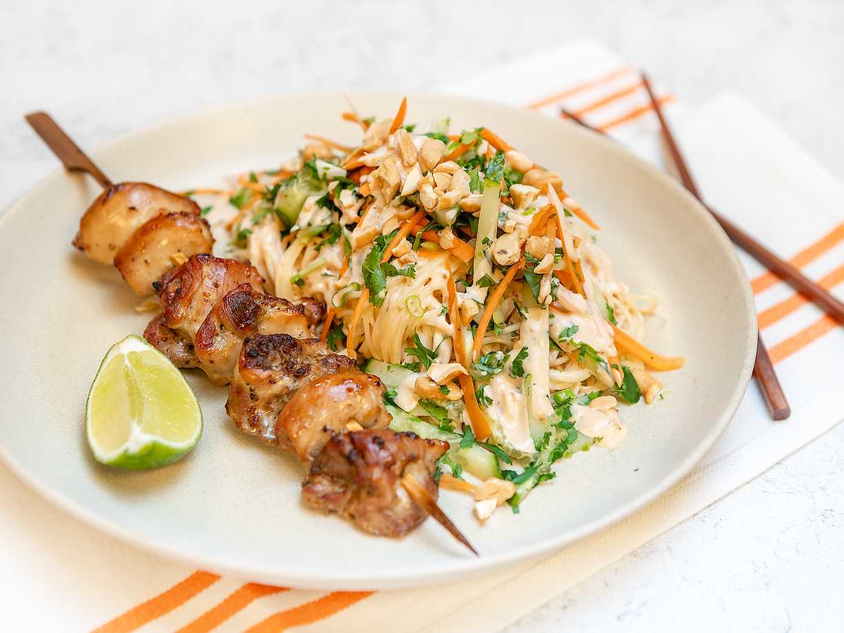 Nudlar med jordnötssås, färs och krispiga grönsaker