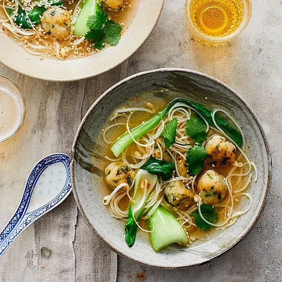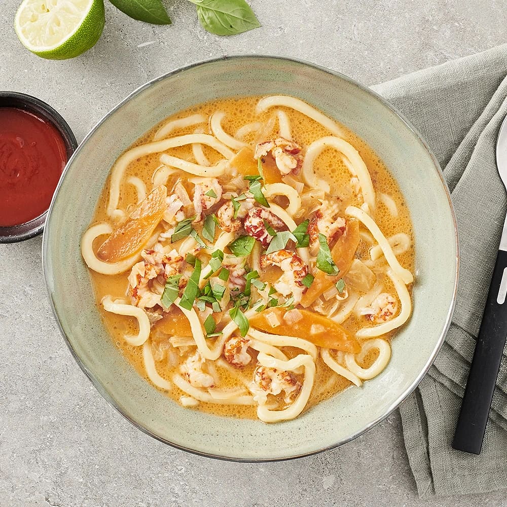 Het hummersoppa med nudlar, pak choi och pilgrimsmussla