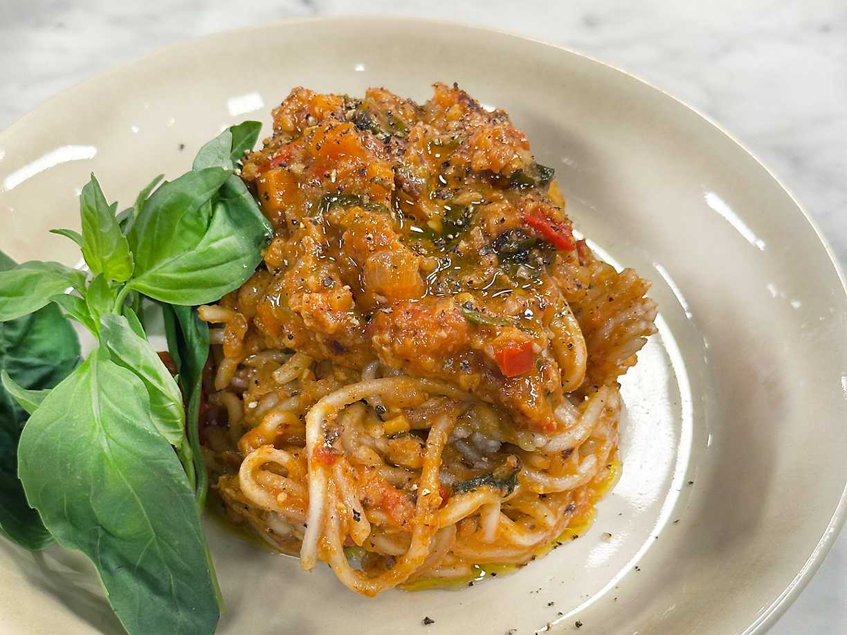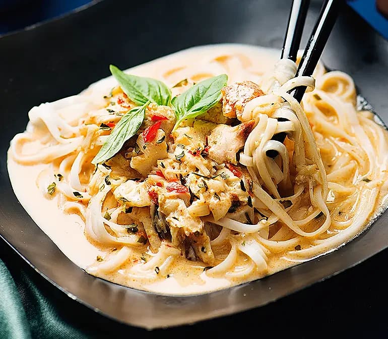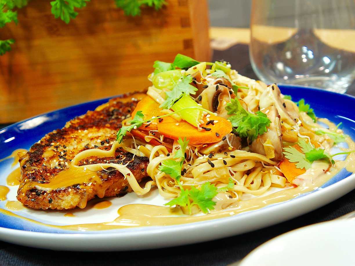 Krämiga nudlar med svamp, fläsk och het sesamsås