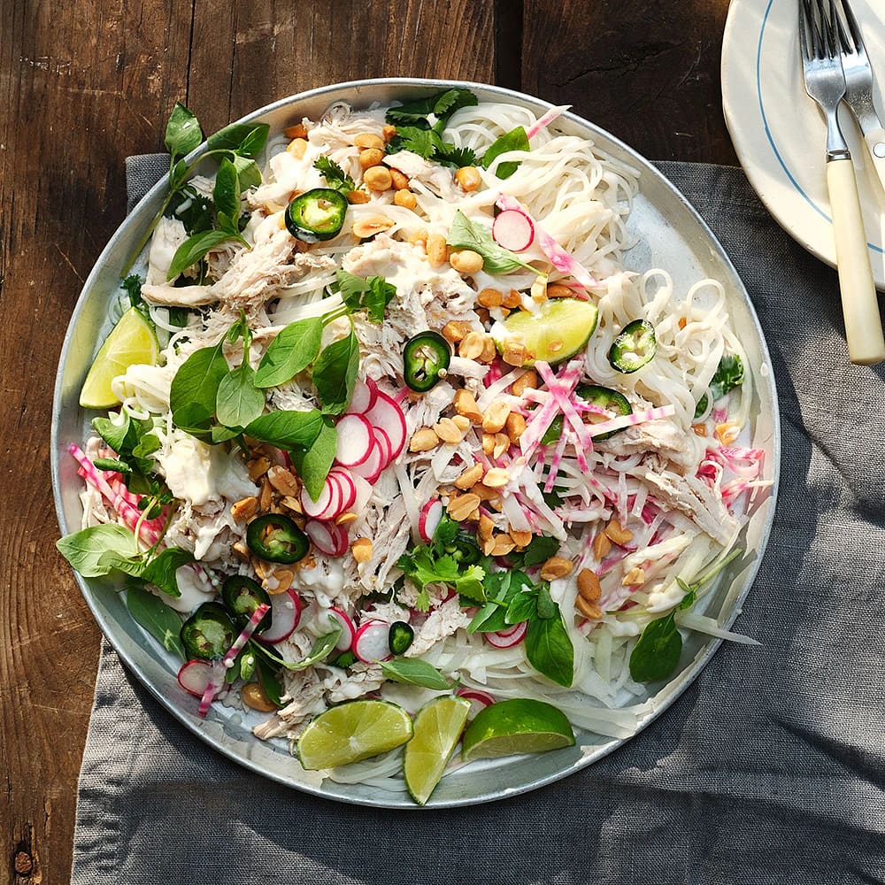 Nudlar med fläskfärs, picklad morot och nuoc cham-dressing