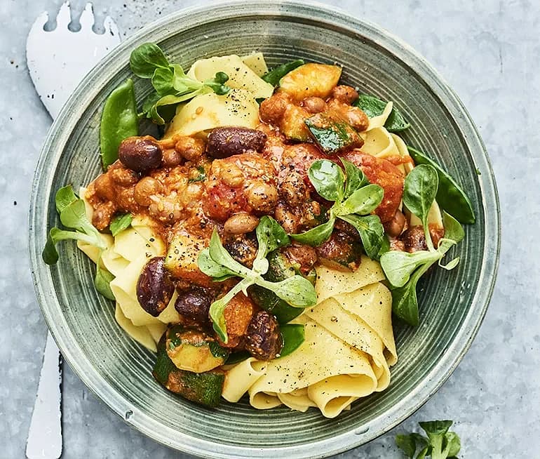 Paprikapappardelle med zucchini och oliver