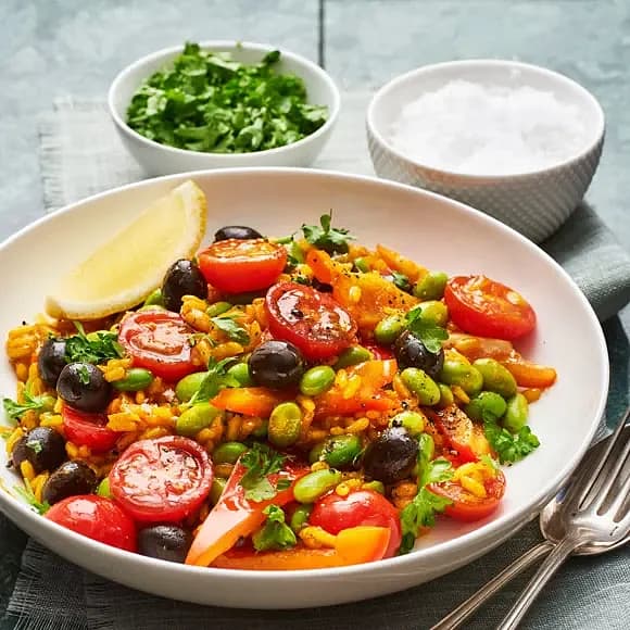 Paella med oliver och sojabönor