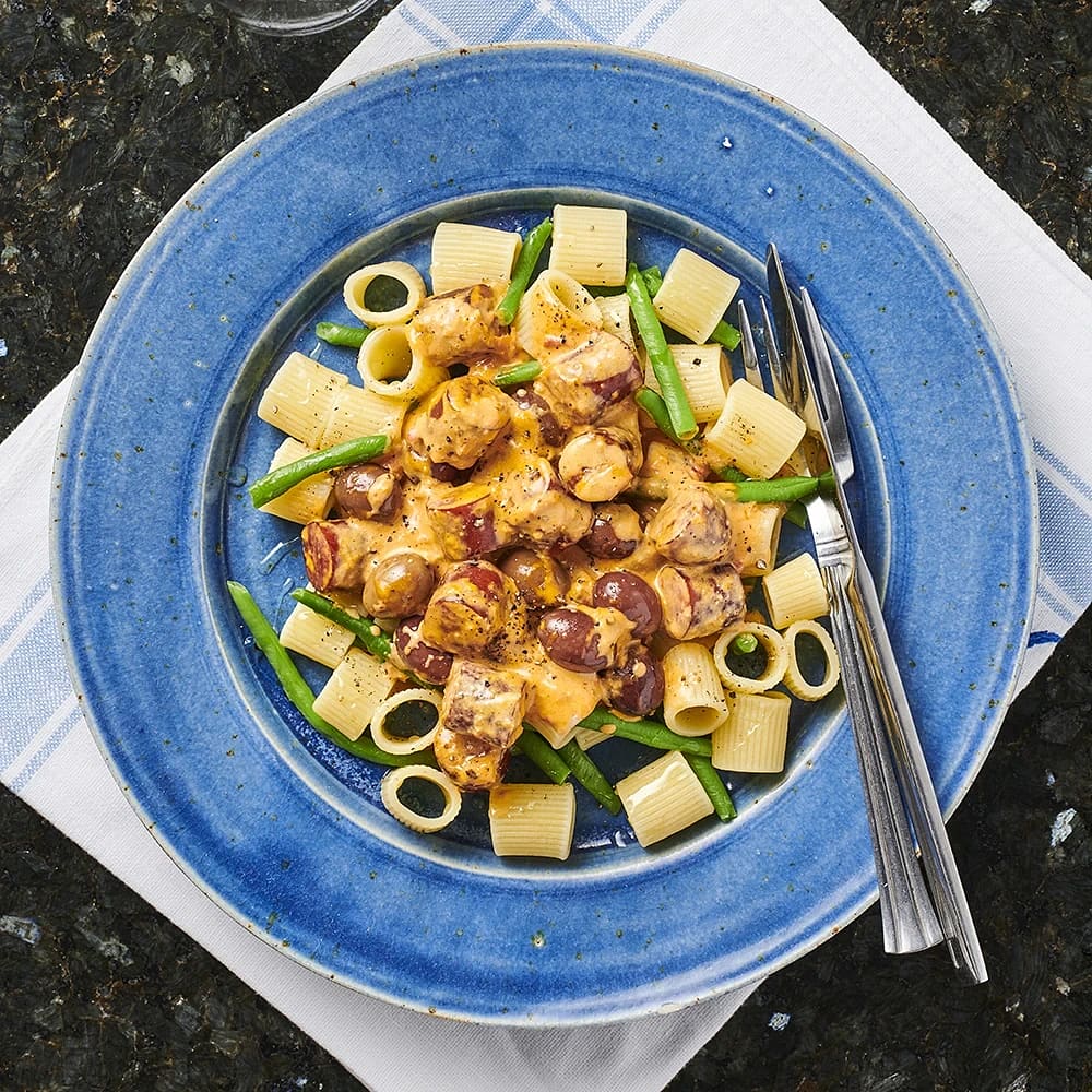 Pasta med kryddkorvsröra och oliver