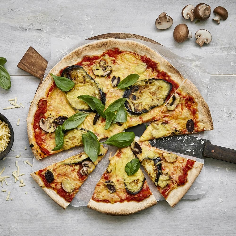Pizza med aubergine, svamp och oliver