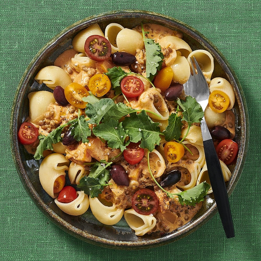 Tomatpasta med grillad paprika och oliver