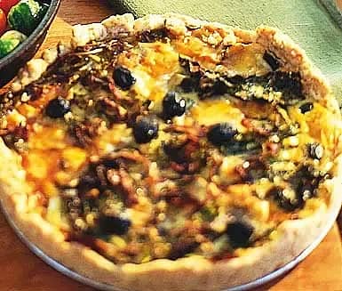 Paj med broccoli, svarta oliver och ädelost