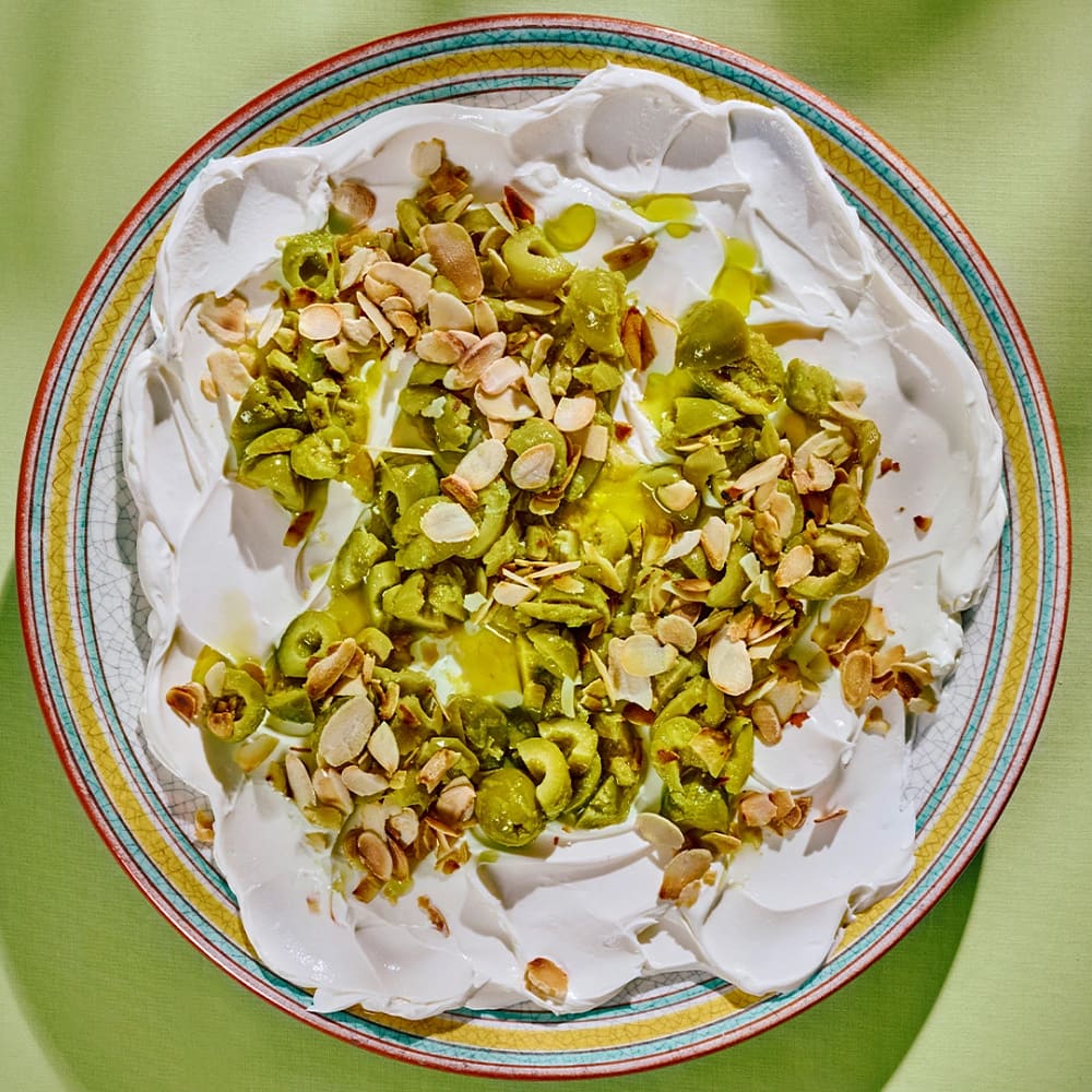 Färskostdipp med oliver och mandel