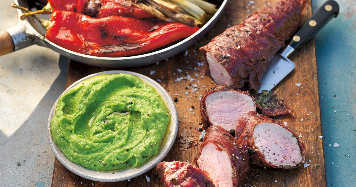 Inlindad fläskfilé, sötsyrlig spetspaprika med oliver och salladslök och ärtguacamole