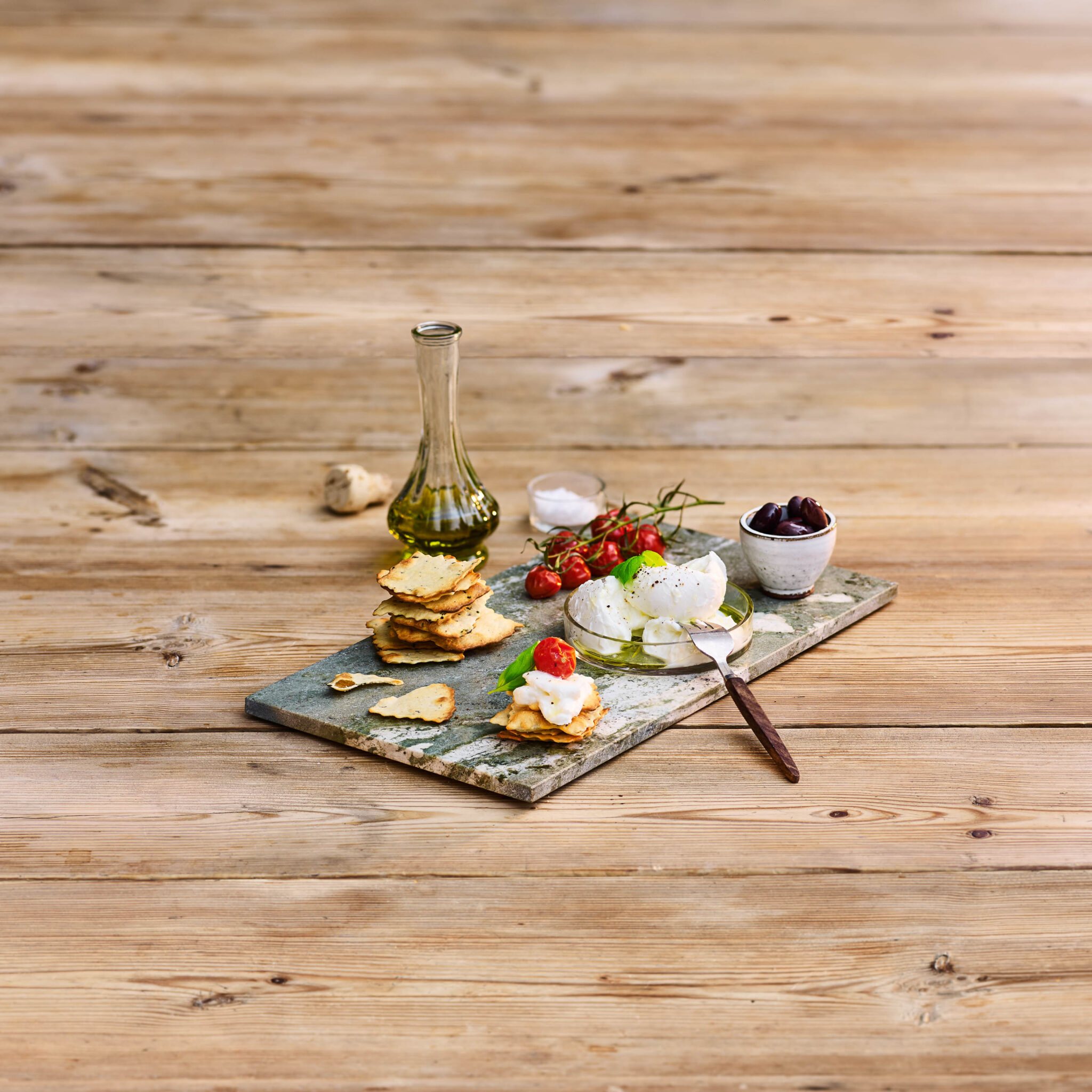 Buffelmozzarella bakad cocktailtomat och oliver med pavesikex