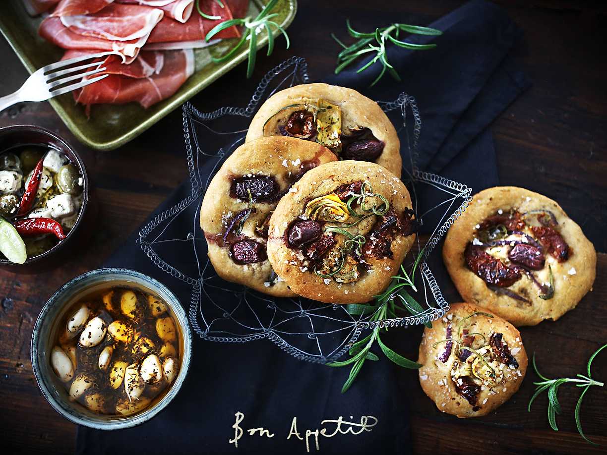 Focaccia med oliver och örtvitlöksklyftor