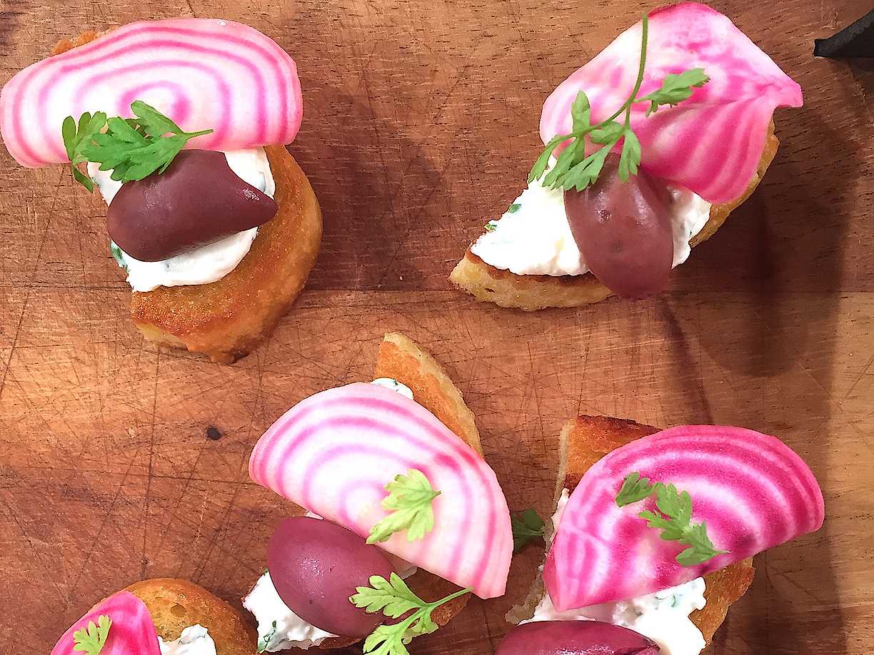 Pinchos med getoströra, råmarinerad polkabeta och oliv