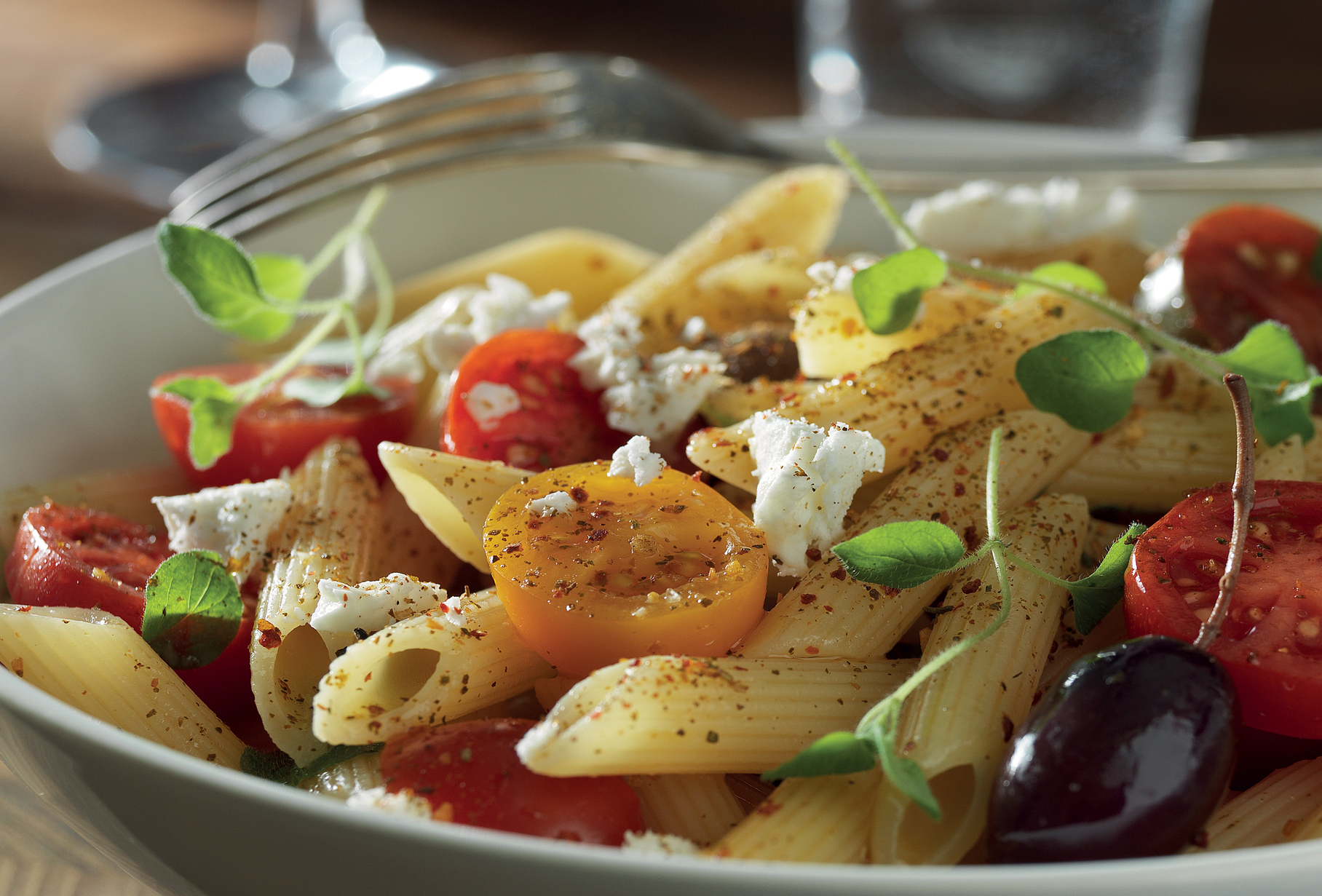 Pasta Tortiglioni med fetaost, tomater och oliver