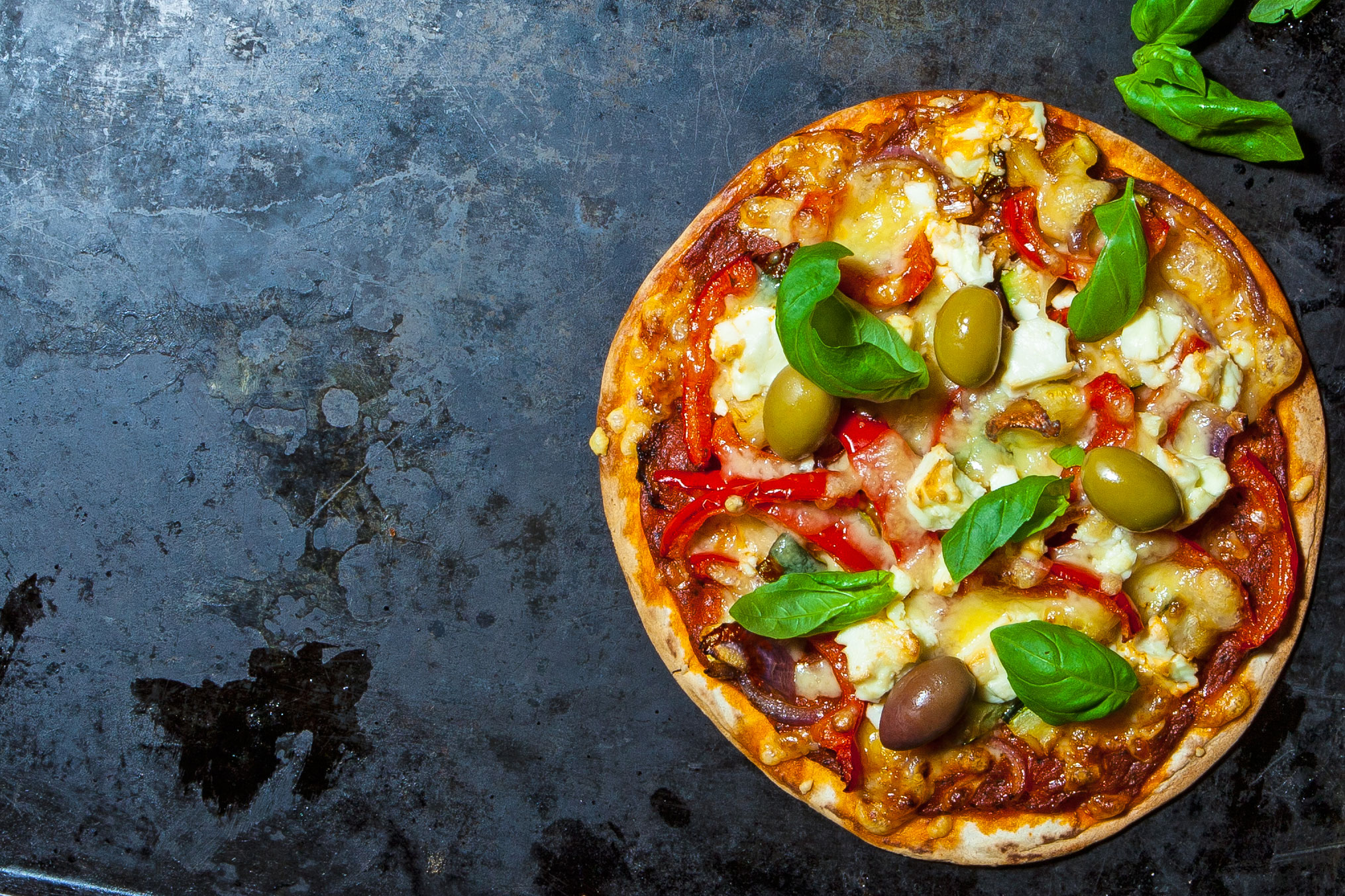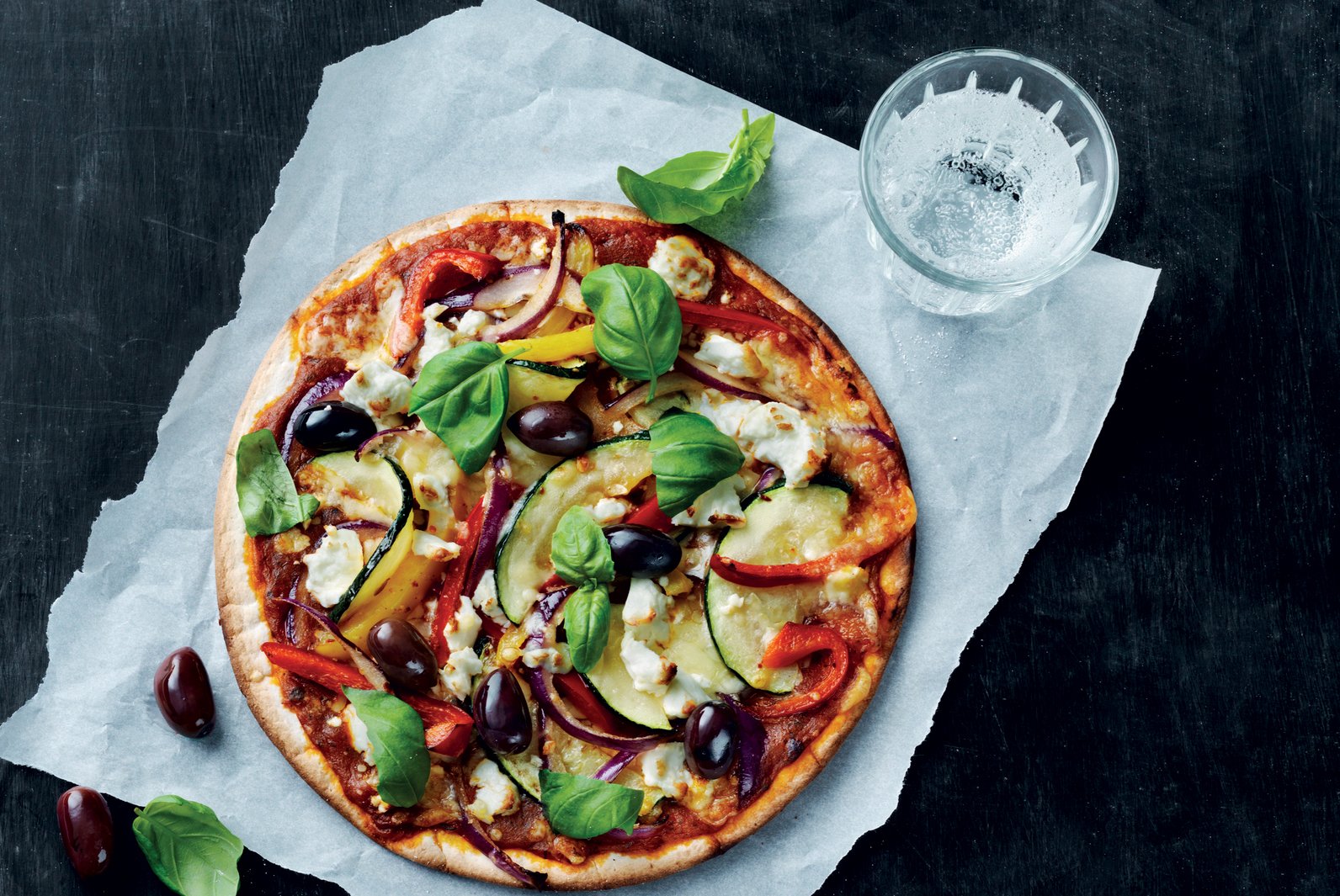 Pizza med grönsaker, feta och oliver