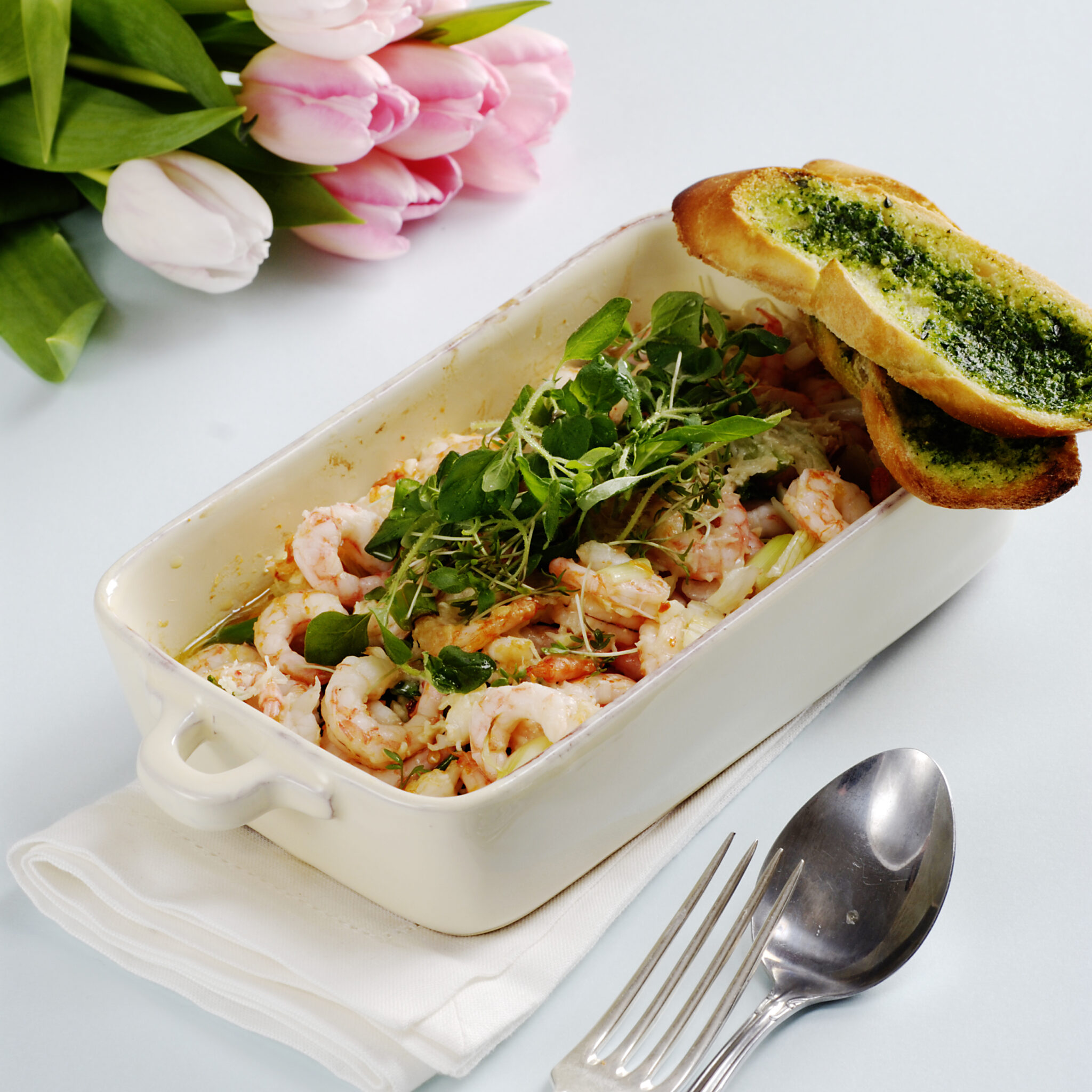 Piripirigratinerde räkor med ört- och vitlöksbröd