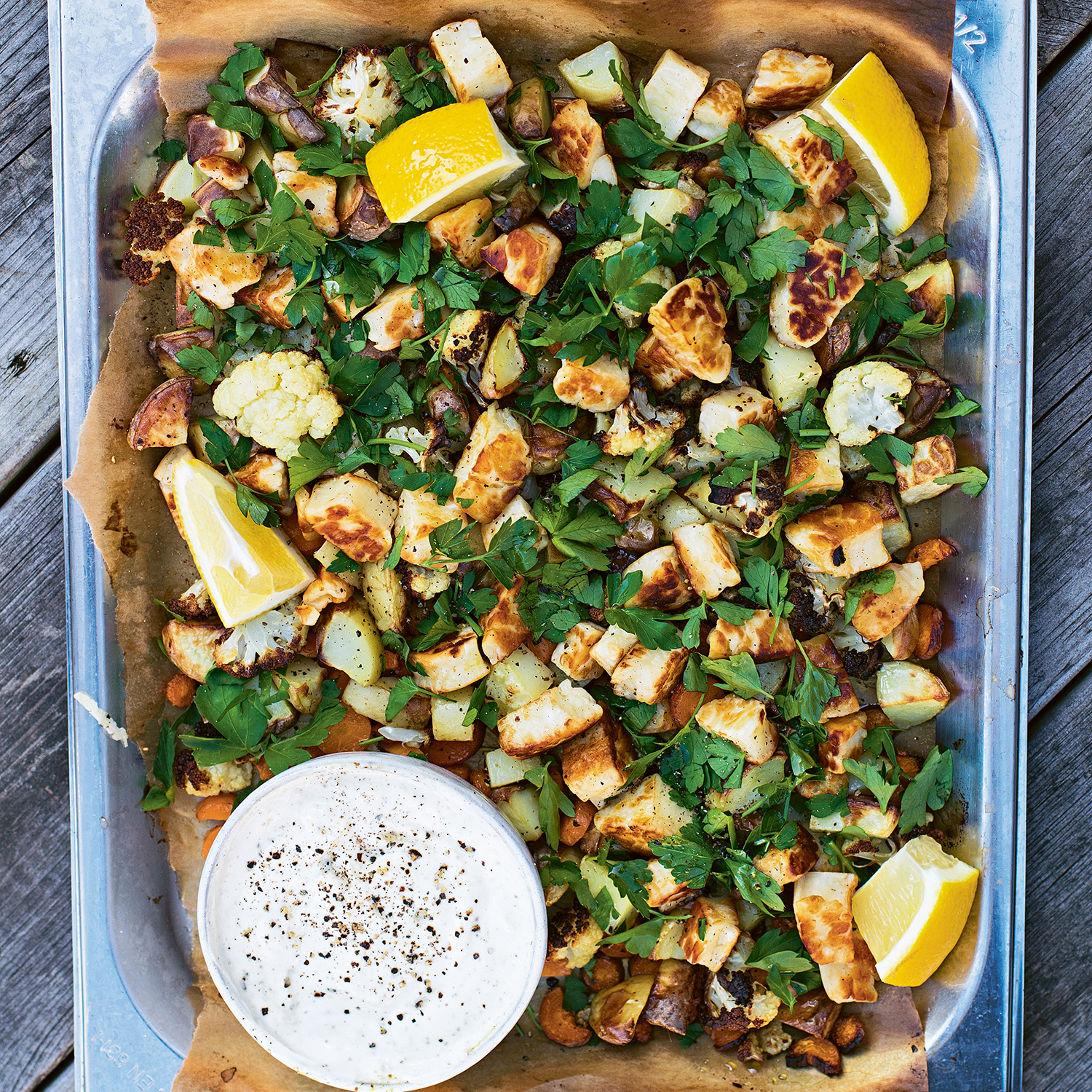 Halloumipytt med örtsmör och senapskräm