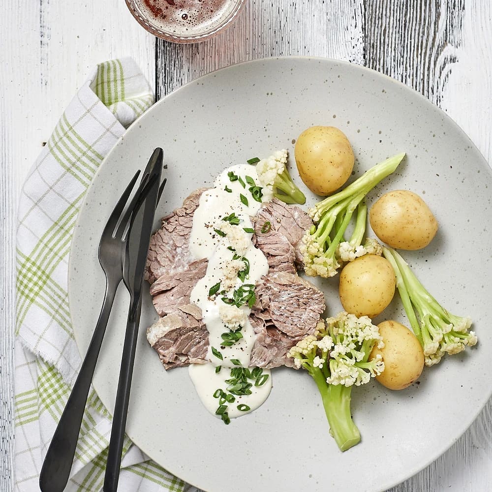 Kokt färsk oxbringa med pepparrotsås