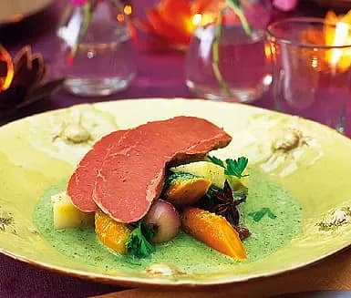 Rimmad oxbringa med rotfrukter och persiljesås