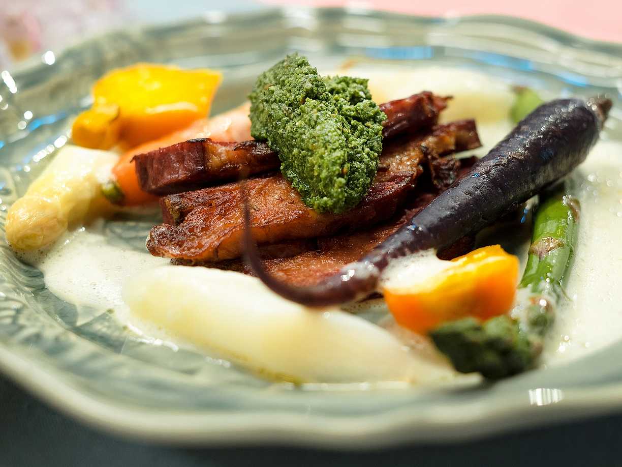Rimmad oxbringa med nässelpesto, primörer och smörad buljong
