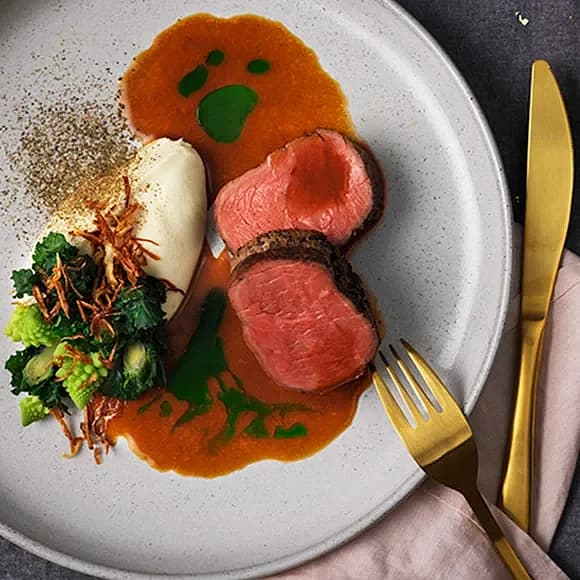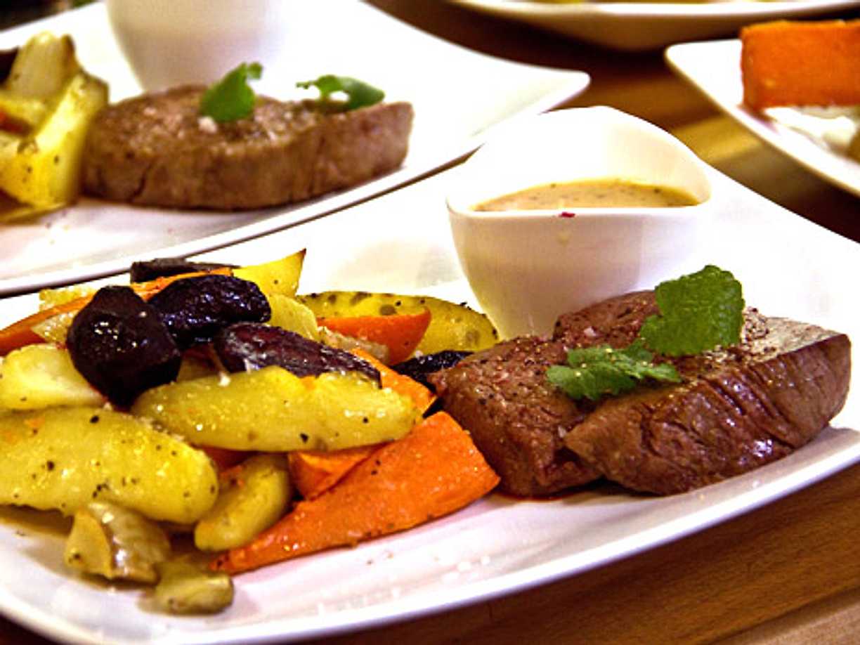 Helstekt oxfilé kryddad med stjärnanis, mandelpotatispuré samt örtgrönsaker